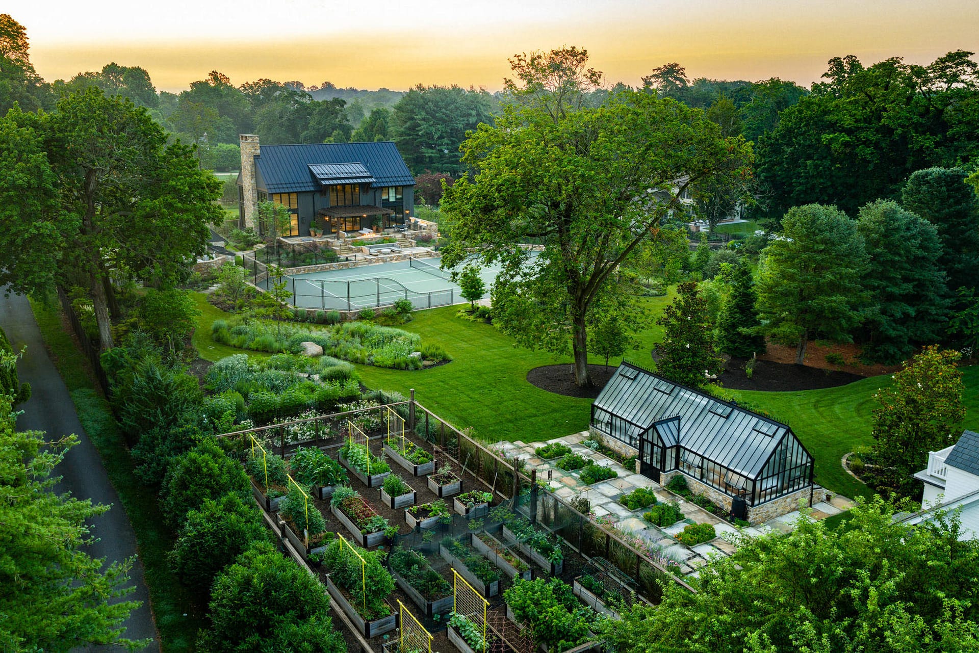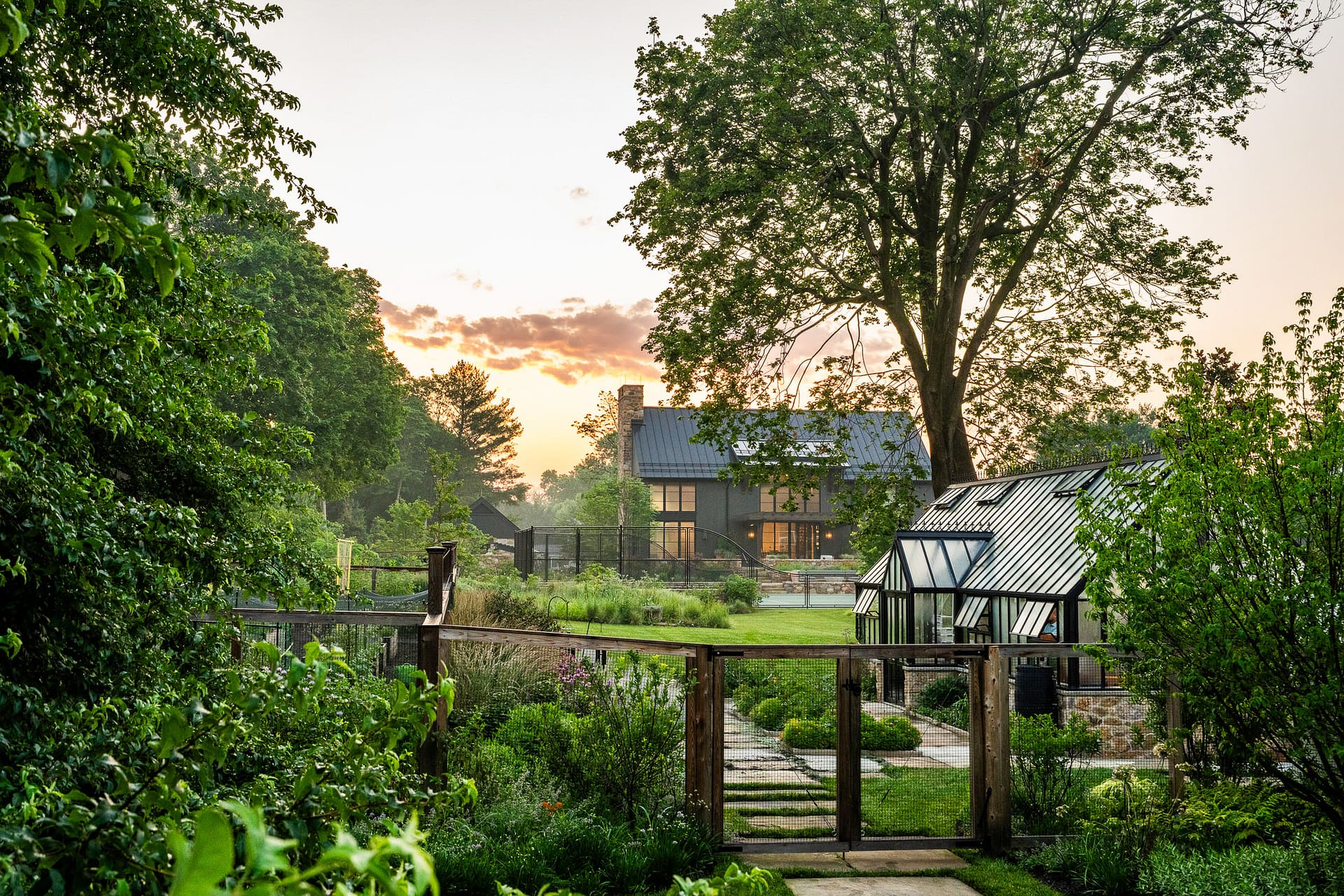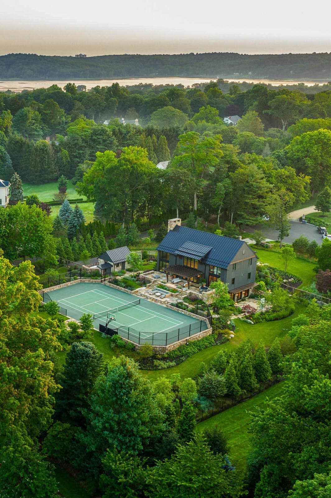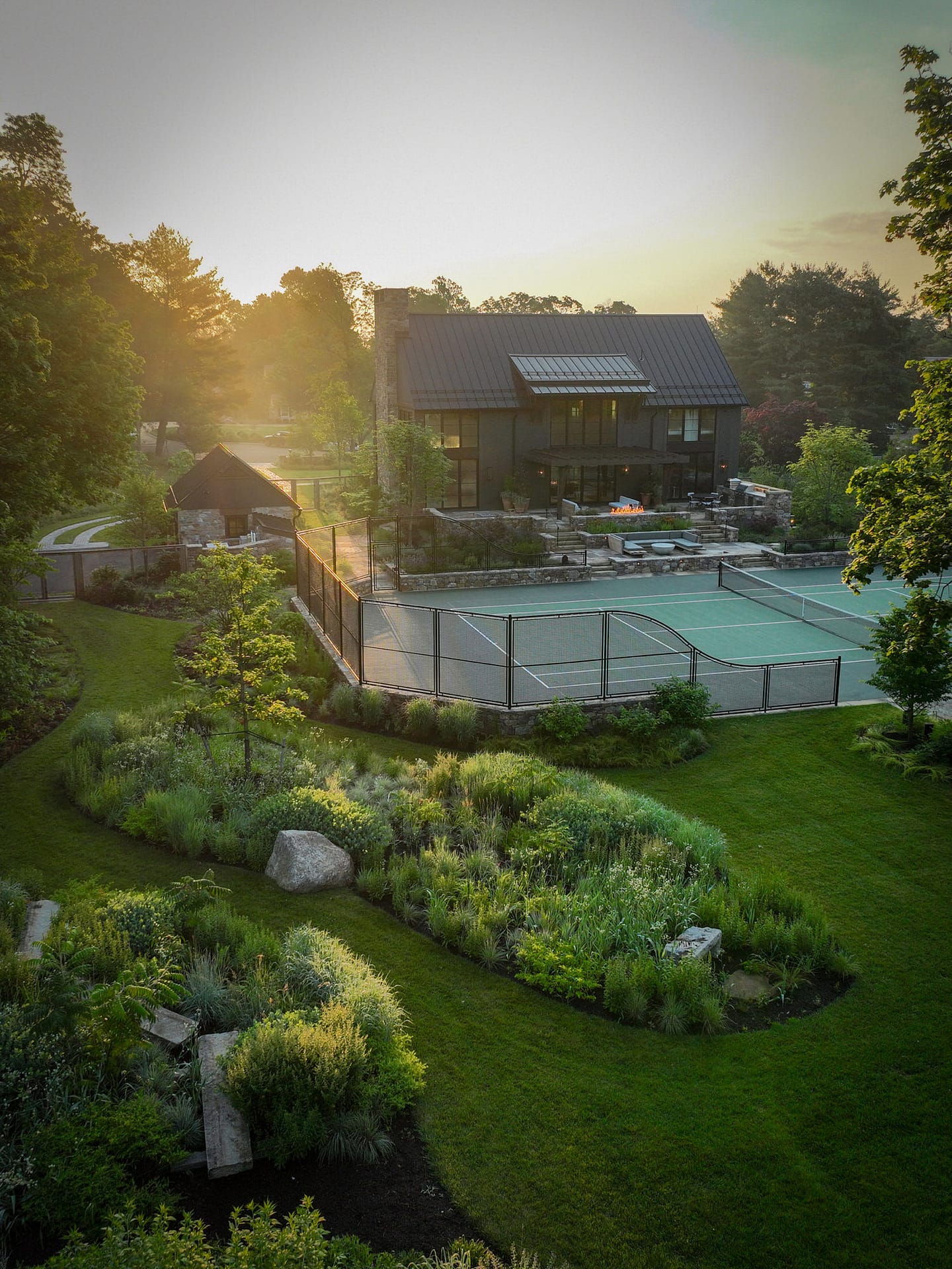 On a serene four-acre coastal property in New Jersey, a Pennsylvania-style barn has been transformed into a contemporary family sanctuary. Heritage, creativity, and connection converge in every corner. Vintage collectibles link past and present. Rustic charm meets modern elegance. The property feels timeless yet alive with daily life. At its heart, the entertainment barn anchors family gatherings. Sunlight floods the great hall. Surrounding it, a chef’s kitchen, wine tasting room, pottery studio, game room, and spa invite creativity, relaxation, and shared joy. Outside, the landscape comes alive. A greenhouse and vegetable garden encourage hands-on family engagement. Native plantings support surrounding wildlife, creating a vibrant, pollinator-rich tapestry. Fruiting trees, berry bushes, and herbs weave edible abundance through native grasses, perennials, and flowering shrubs. Layered textures, shifting seasonal colors, and meandering paths create discovery, movement, and quiet reflection. Garden terraces frame views, offering spaces for play, work, and rest. A new tennis court—the original spark for the project—anchors the recreational side of the property. From concept to completion, architecture and landscape were envisioned as one, resulting in a cohesive retreat that fosters family and celebrates the beauty of the built and natural world alike.