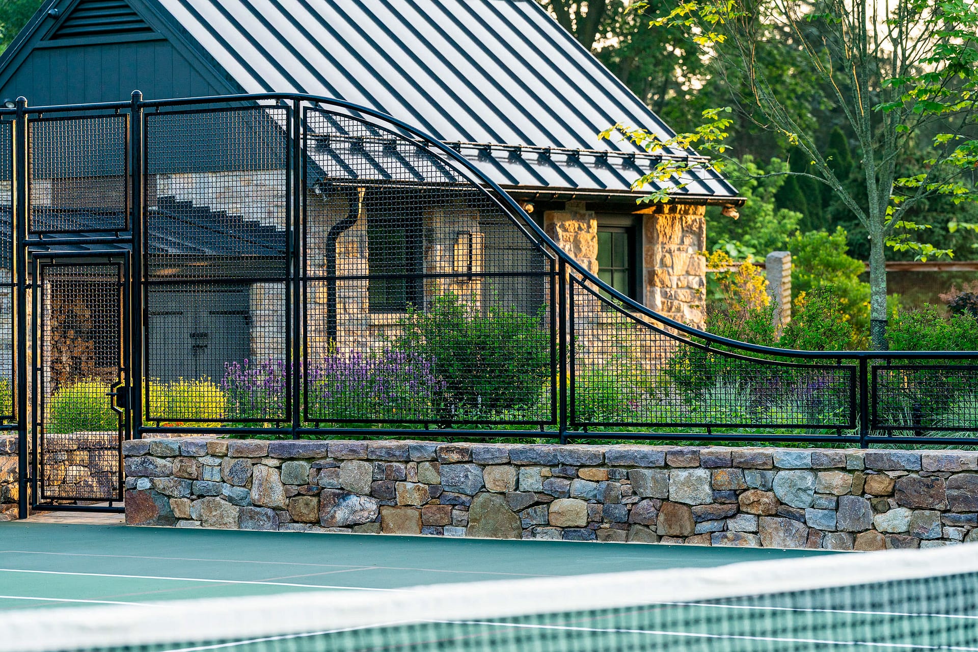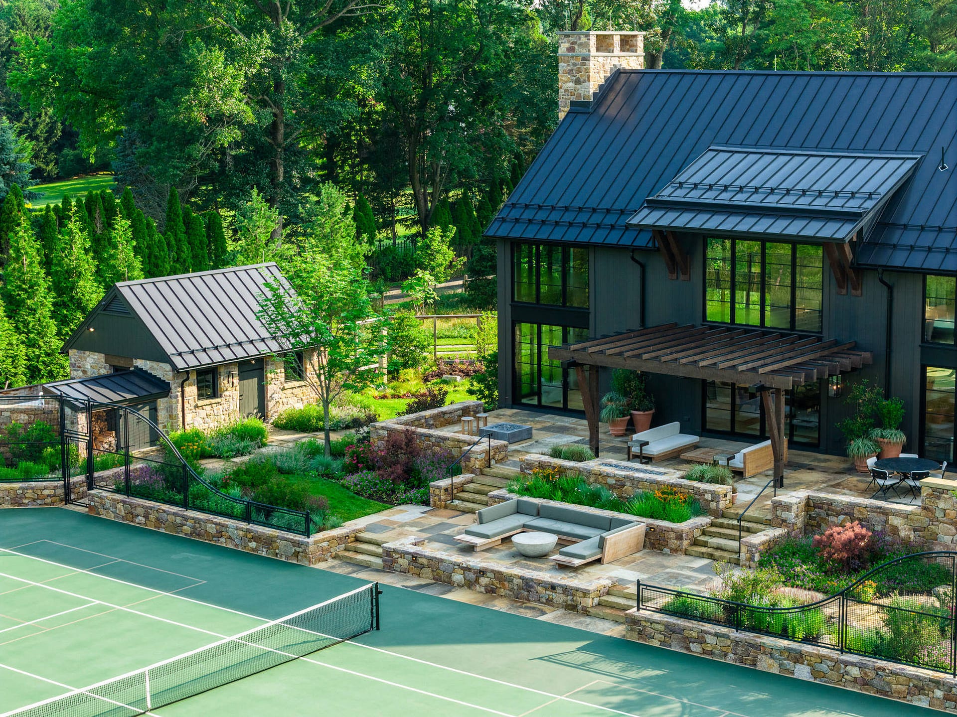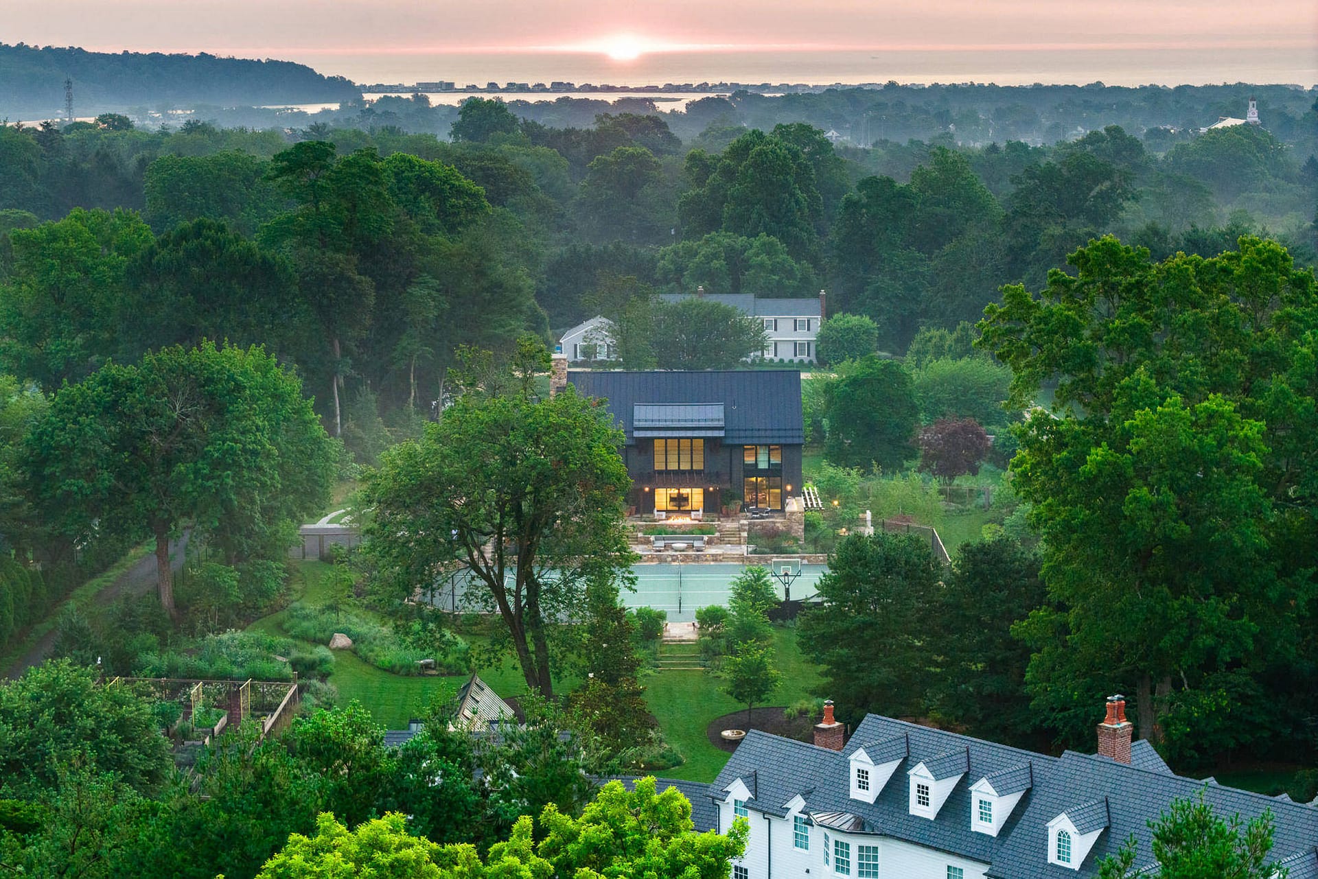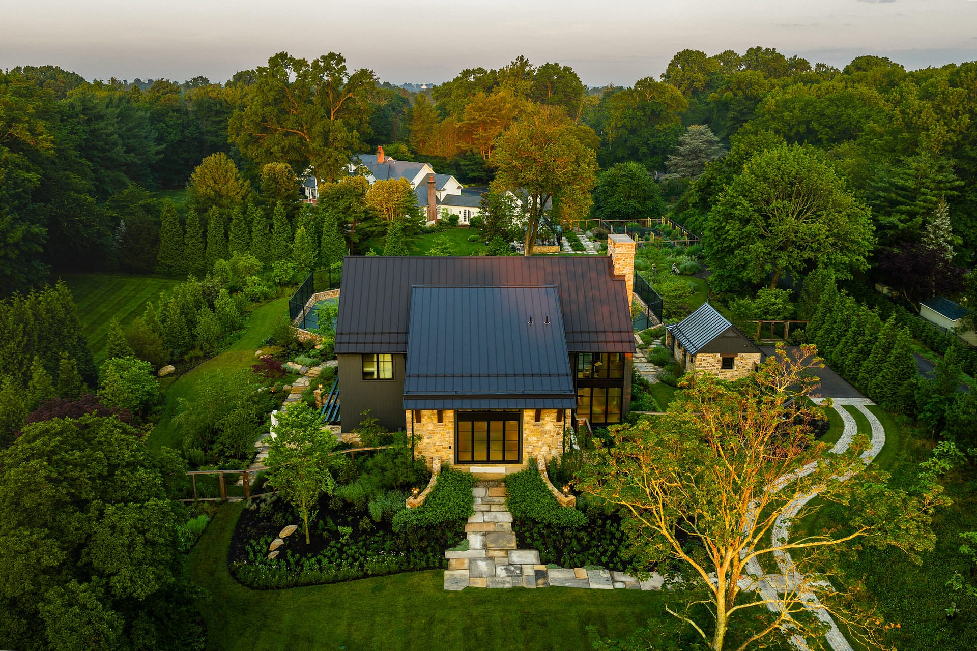 On a serene four-acre coastal property in New Jersey, a Pennsylvania-style barn has been transformed into a contemporary family sanctuary. Heritage, creativity, and connection converge in every corner. Vintage collectibles link past and present. Rustic charm meets modern elegance. The property feels timeless yet alive with daily life. At its heart, the entertainment barn anchors family gatherings. Sunlight floods the great hall. Surrounding it, a chef’s kitchen, wine tasting room, pottery studio, game room, and spa invite creativity, relaxation, and shared joy. Outside, the landscape comes alive. A greenhouse and vegetable garden encourage hands-on family engagement. Native plantings support surrounding wildlife, creating a vibrant, pollinator-rich tapestry. Fruiting trees, berry bushes, and herbs weave edible abundance through native grasses, perennials, and flowering shrubs. Layered textures, shifting seasonal colors, and meandering paths create discovery, movement, and quiet reflection. Garden terraces frame views, offering spaces for play, work, and rest. A new tennis court—the original spark for the project—anchors the recreational side of the property. From concept to completion, architecture and landscape were envisioned as one, resulting in a cohesive retreat that fosters family and celebrates the beauty of the built and natural world alike.