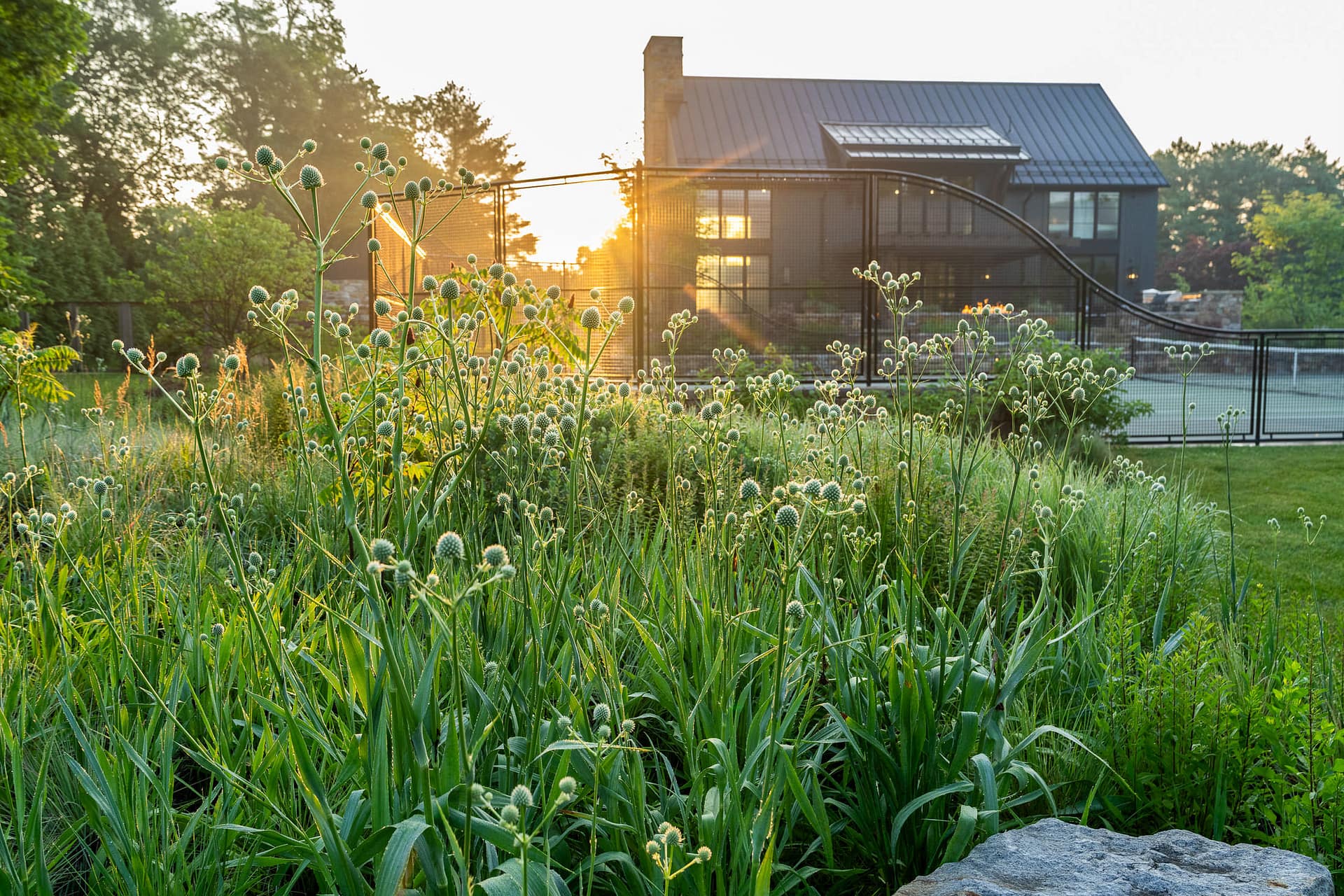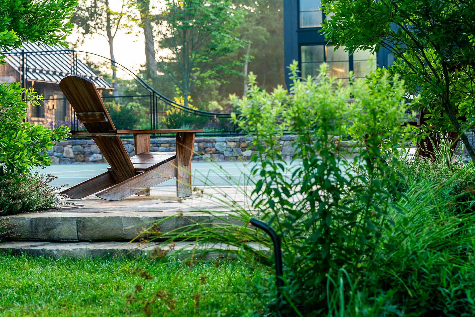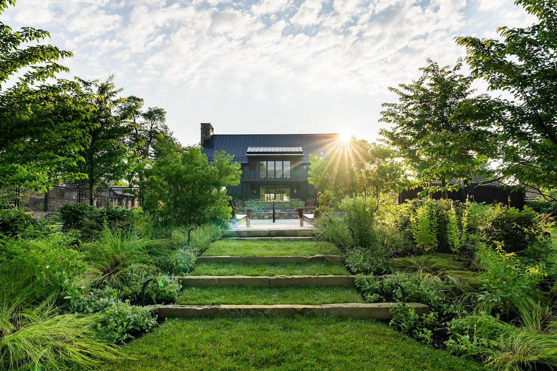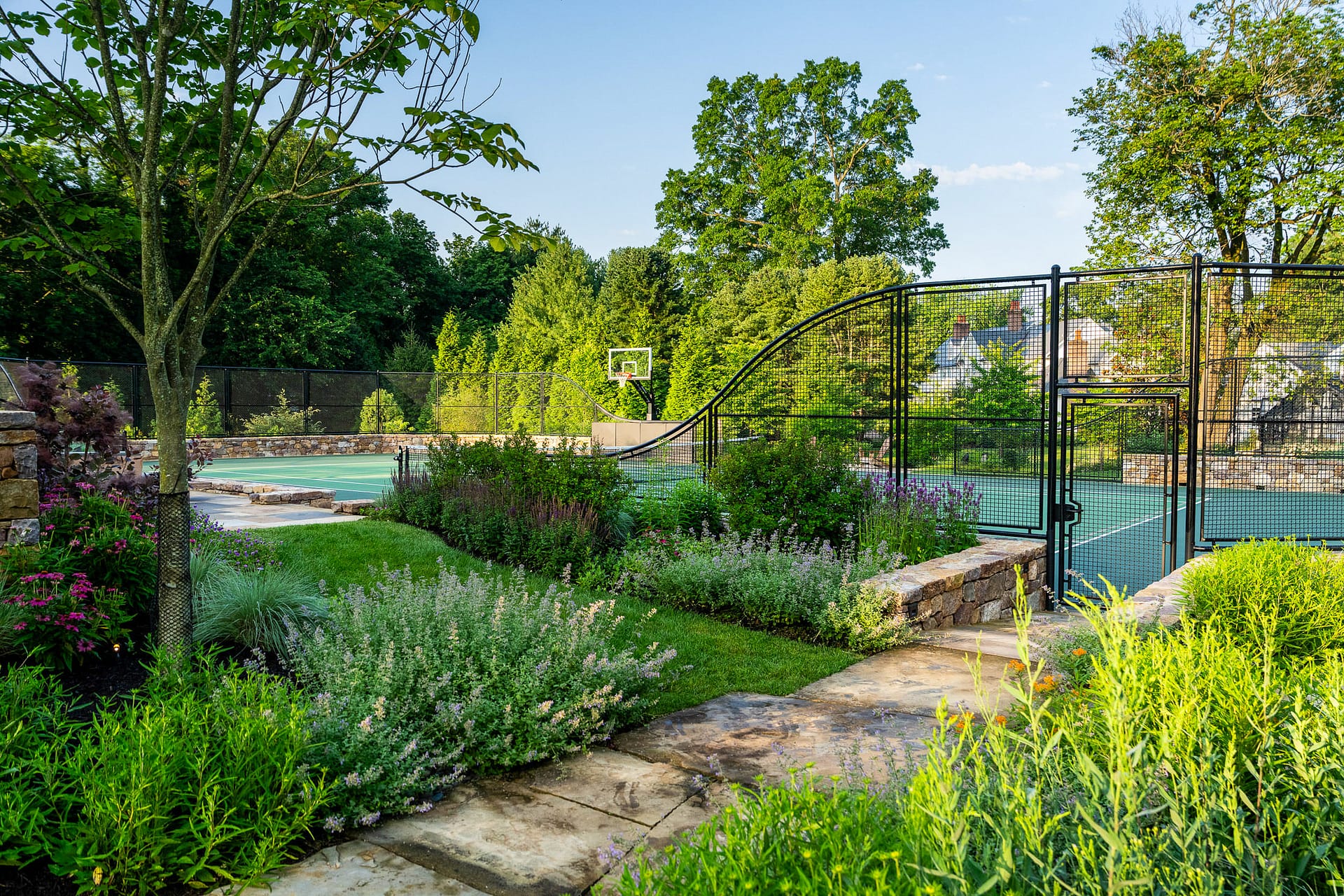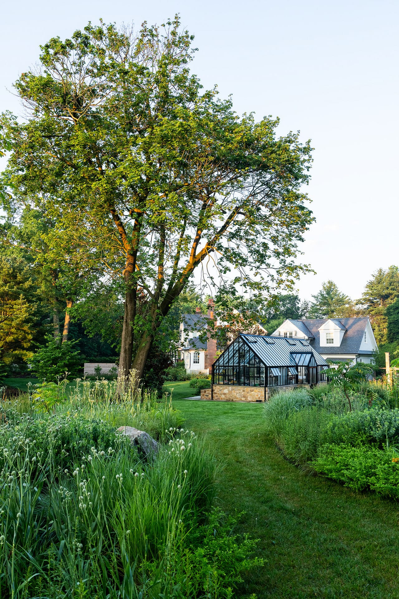 On a serene four-acre coastal property in New Jersey, a Pennsylvania-style barn has been transformed into a contemporary family sanctuary. Heritage, creativity, and connection converge in every corner. Vintage collectibles link past and present. Rustic charm meets modern elegance. The property feels timeless yet alive with daily life. At its heart, the entertainment barn anchors family gatherings. Sunlight floods the great hall. Surrounding it, a chef’s kitchen, wine tasting room, pottery studio, game room, and spa invite creativity, relaxation, and shared joy. Outside, the landscape comes alive. A greenhouse and vegetable garden encourage hands-on family engagement. Native plantings support surrounding wildlife, creating a vibrant, pollinator-rich tapestry. Fruiting trees, berry bushes, and herbs weave edible abundance through native grasses, perennials, and flowering shrubs. Layered textures, shifting seasonal colors, and meandering paths create discovery, movement, and quiet reflection. Garden terraces frame views, offering spaces for play, work, and rest. A new tennis court—the original spark for the project—anchors the recreational side of the property. From concept to completion, architecture and landscape were envisioned as one, resulting in a cohesive retreat that fosters family and celebrates the beauty of the built and natural world alike.
