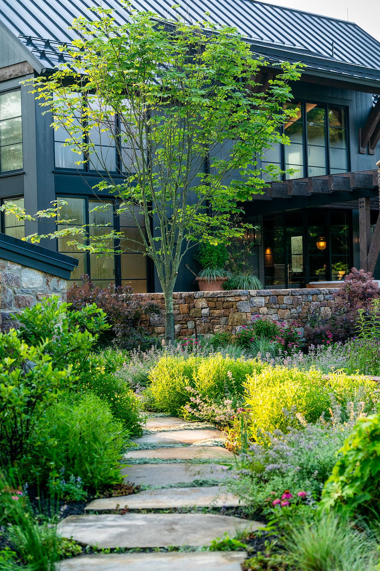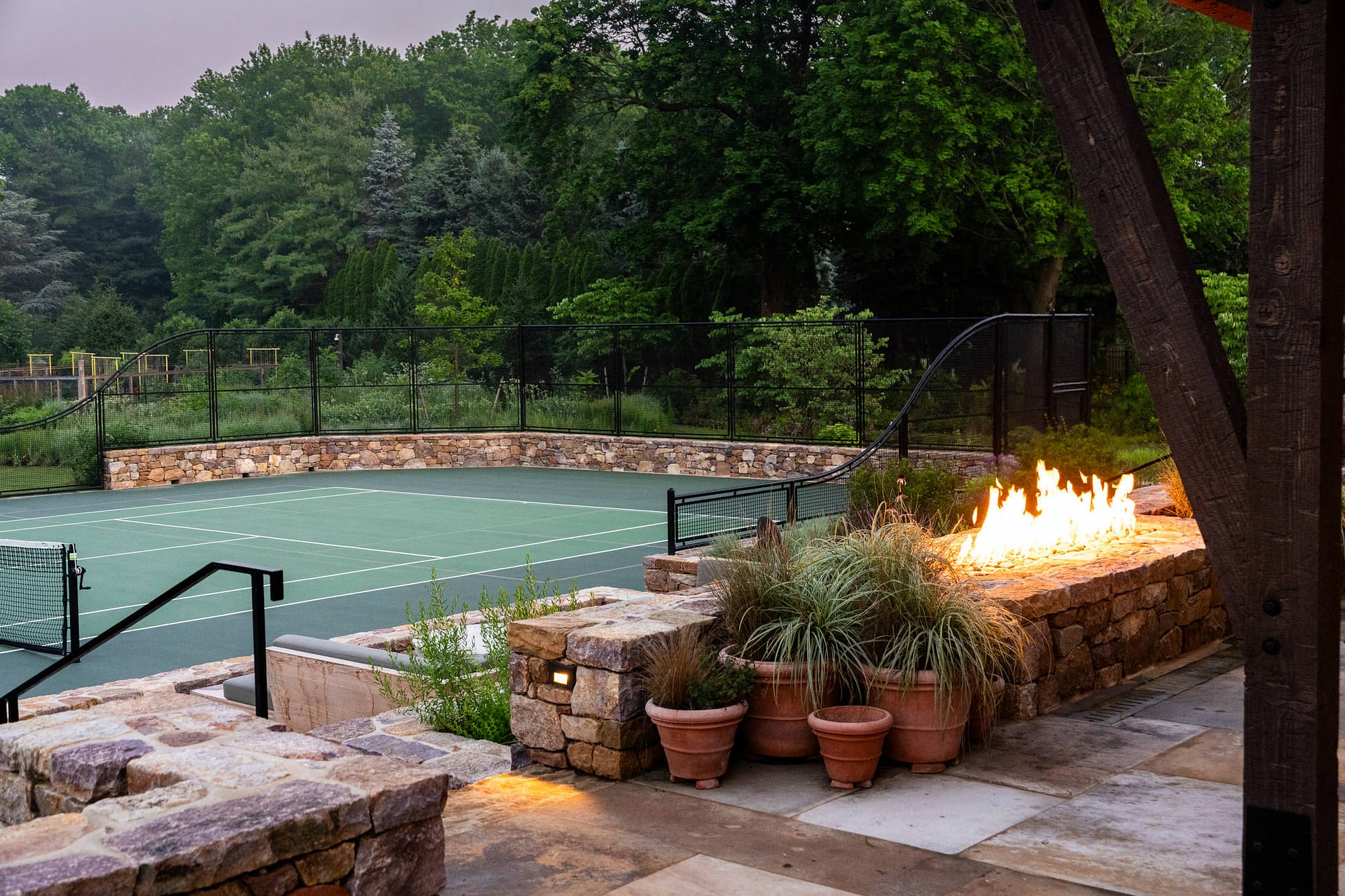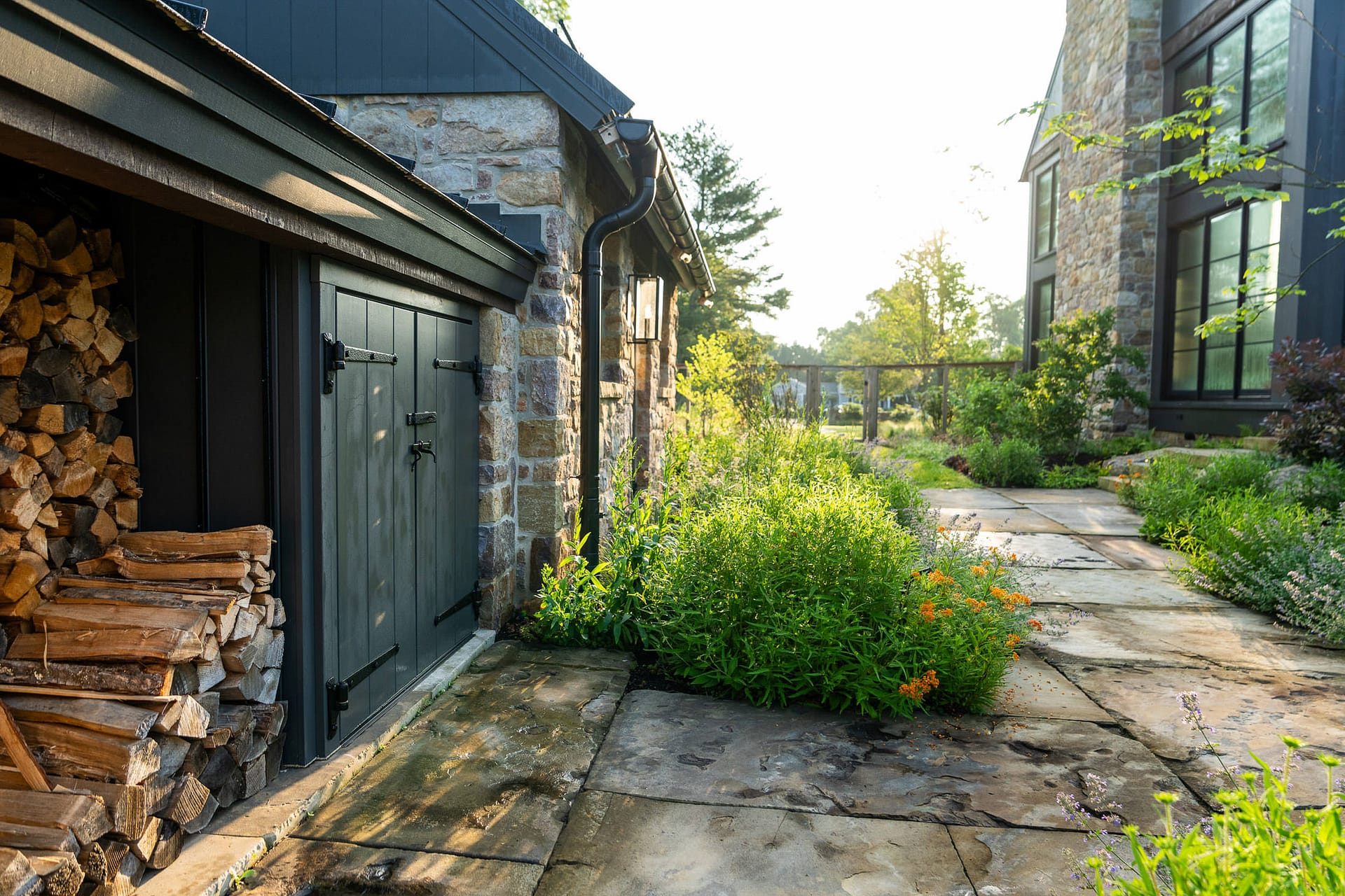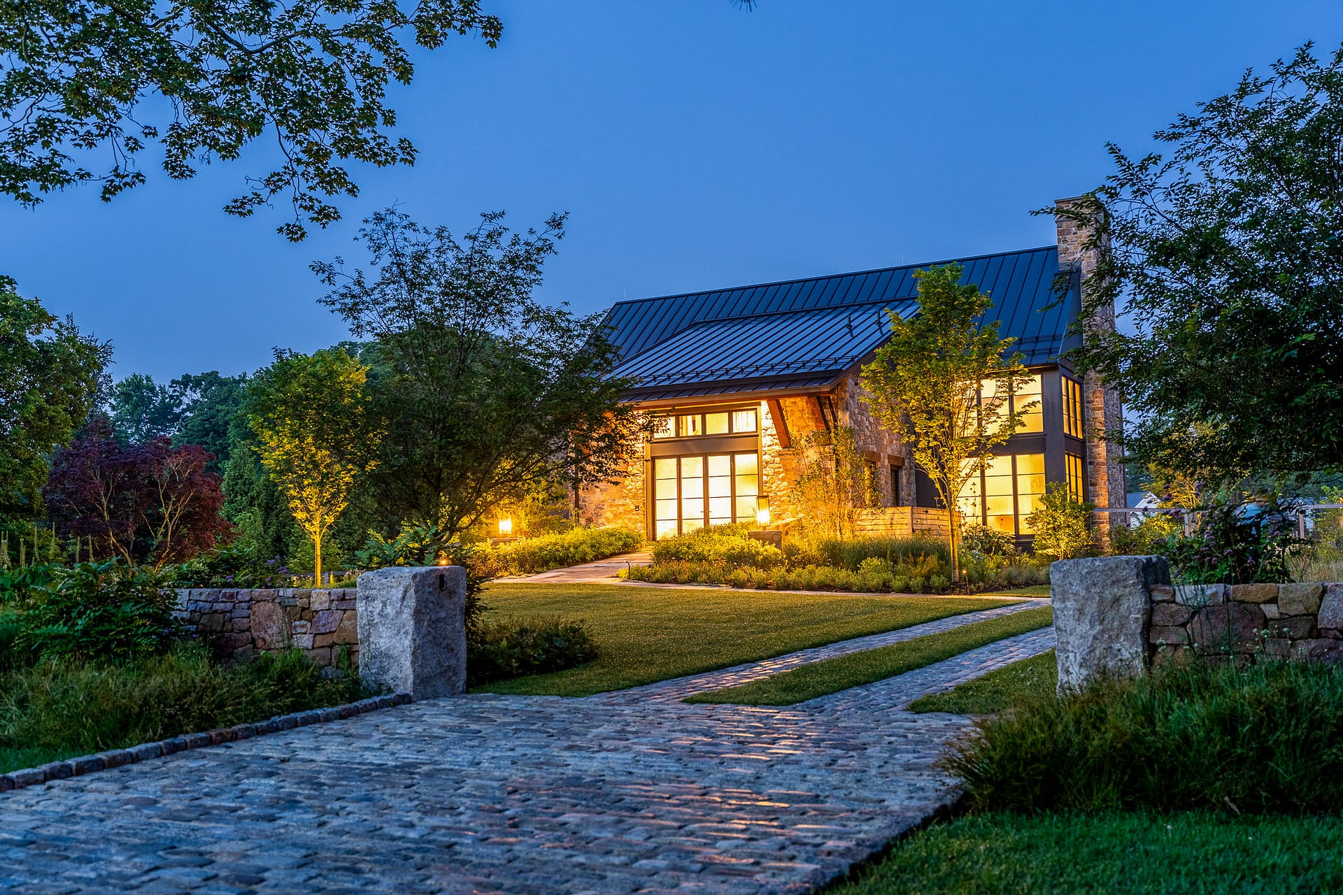 On a serene four-acre coastal property in New Jersey, a Pennsylvania-style barn has been transformed into a contemporary family sanctuary. Heritage, creativity, and connection converge in every corner. Vintage collectibles link past and present. Rustic charm meets modern elegance. The property feels timeless yet alive with daily life. At its heart, the entertainment barn anchors family gatherings. Sunlight floods the great hall. Surrounding it, a chef’s kitchen, wine tasting room, pottery studio, game room, and spa invite creativity, relaxation, and shared joy. Outside, the landscape comes alive. A greenhouse and vegetable garden encourage hands-on family engagement. Native plantings support surrounding wildlife, creating a vibrant, pollinator-rich tapestry. Fruiting trees, berry bushes, and herbs weave edible abundance through native grasses, perennials, and flowering shrubs. Layered textures, shifting seasonal colors, and meandering paths create discovery, movement, and quiet reflection. Garden terraces frame views, offering spaces for play, work, and rest. A new tennis court—the original spark for the project—anchors the recreational side of the property. From concept to completion, architecture and landscape were envisioned as one, resulting in a cohesive retreat that fosters family and celebrates the beauty of the built and natural world alike.