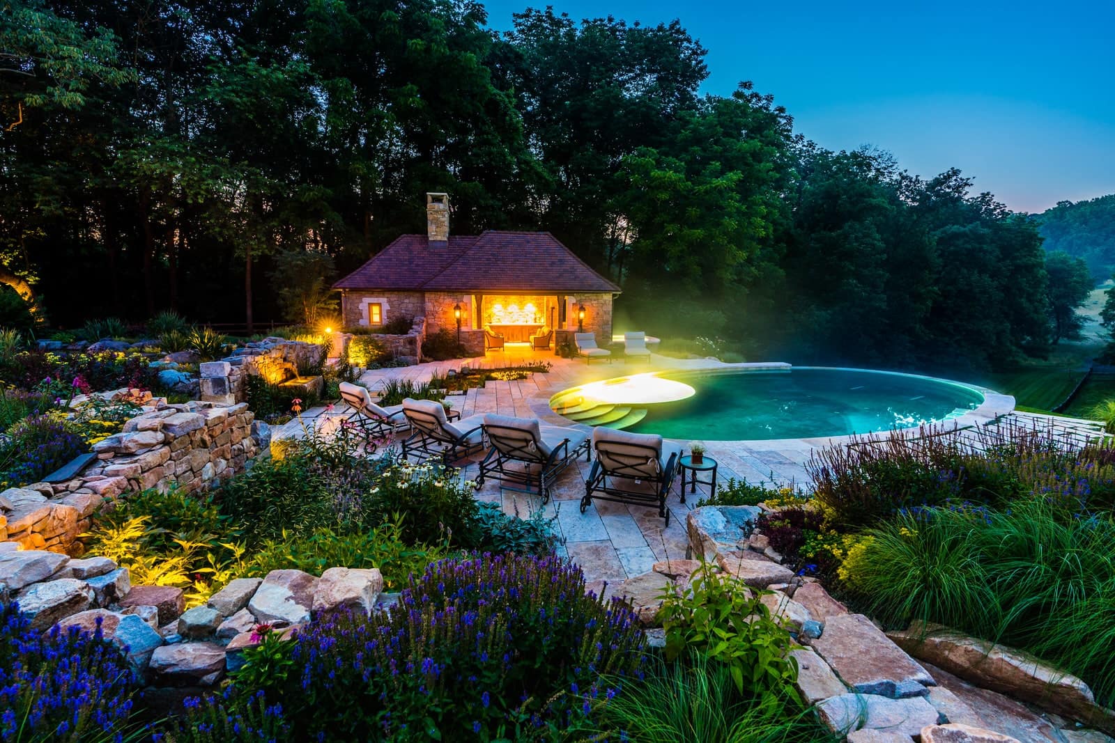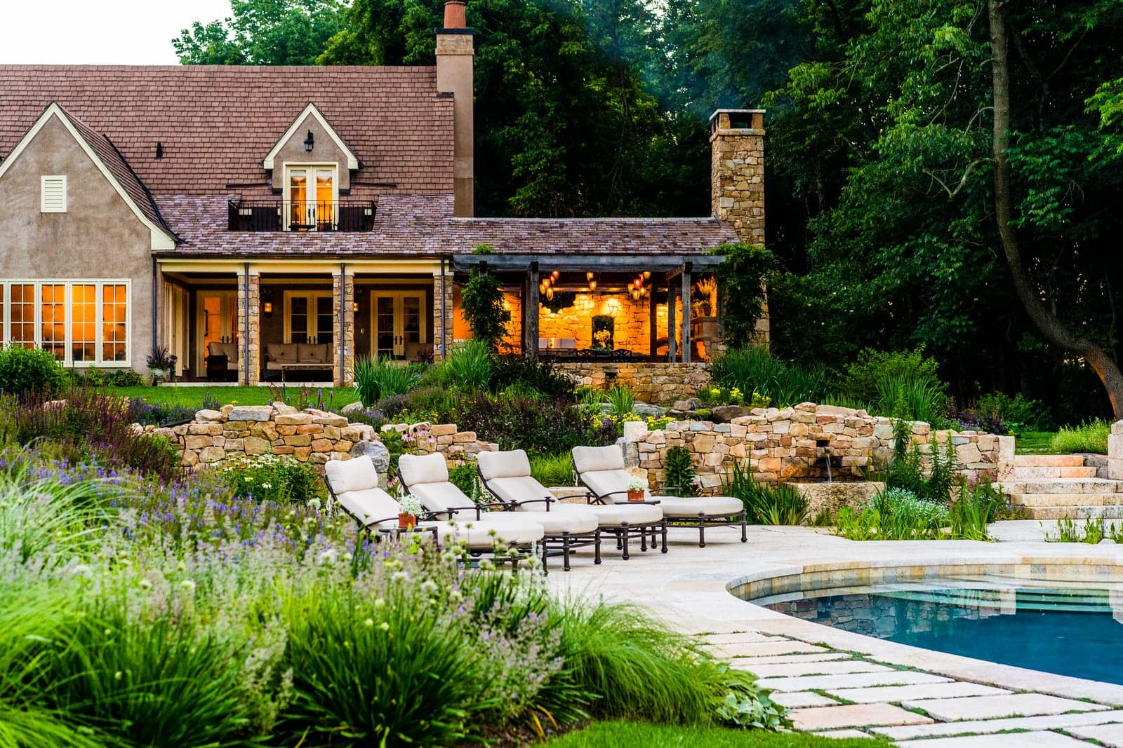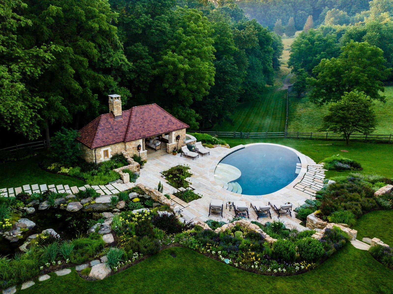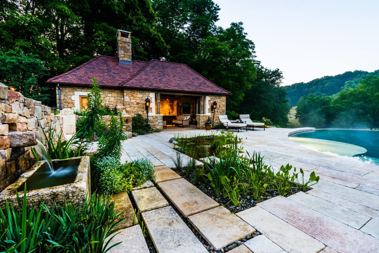 This remarkable project evolved from a simple swimming pool project into a much grander, more complicated venture. A simple oval pool was embellished with a vanishing edge detail, a separate four-season spa, a new open pool pavilion, and a collection of remnant structures suggesting a time-worn ruin or bygone farmstead, adapted for reuse. In keeping with the French Provençal vernacular, richly-textured antique limestone was used throughout the project for continuity. An outdoor kitchen space was developed closer to the main house, complete with a rustic timber pergola, antique stone sink, and striking outdoor fireplace. To connect this space with the pool, a recirculating series of ponds, rills, and waterfalls flow downgrade towards the pool, ending in a bog planting; the moving water becomes the datum around which the other site elements relate. The bog also clarifies stormwater via bioremediation. Surrounding plantings reflect the loose nature of the layout, suggesting nature is slowly overtaking the space while the built world is receding further into antiquity.