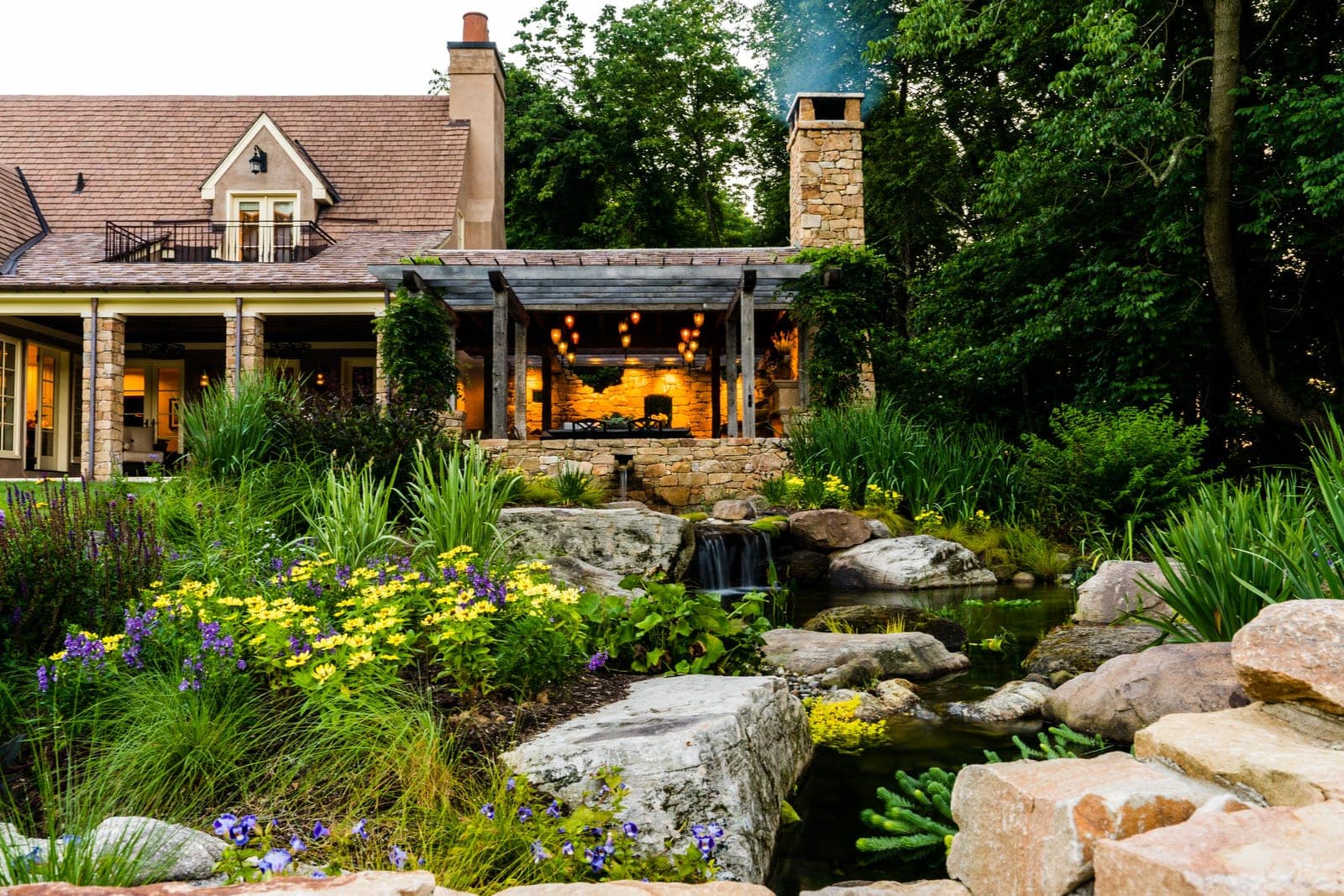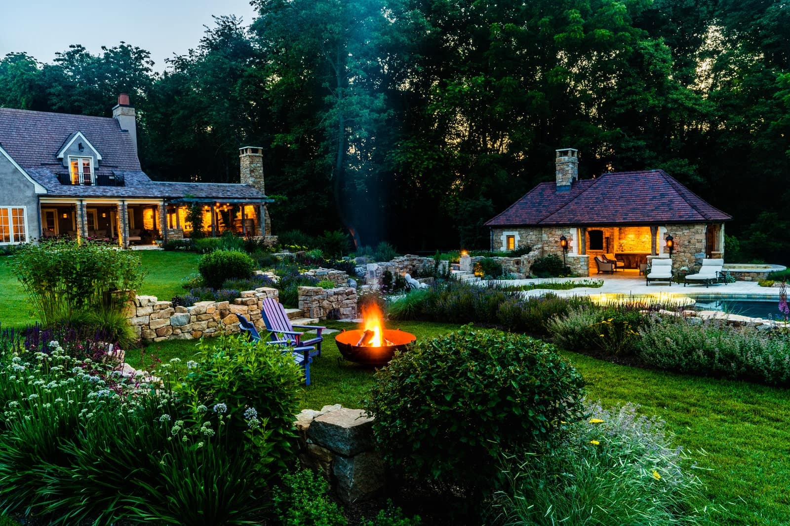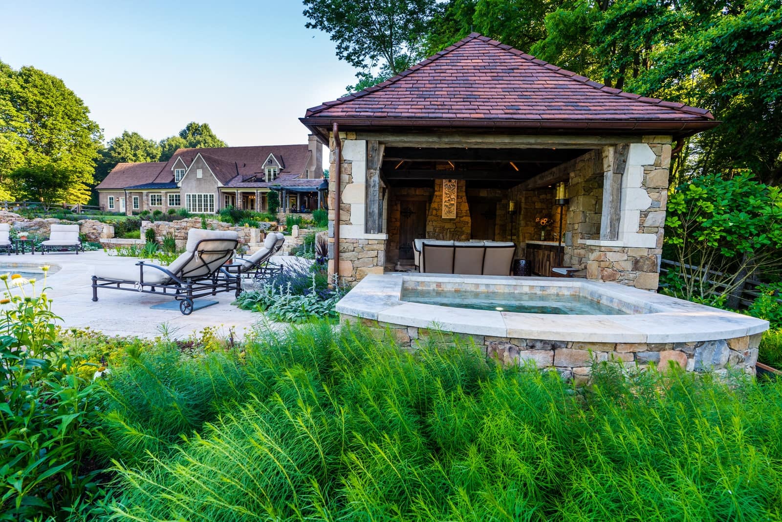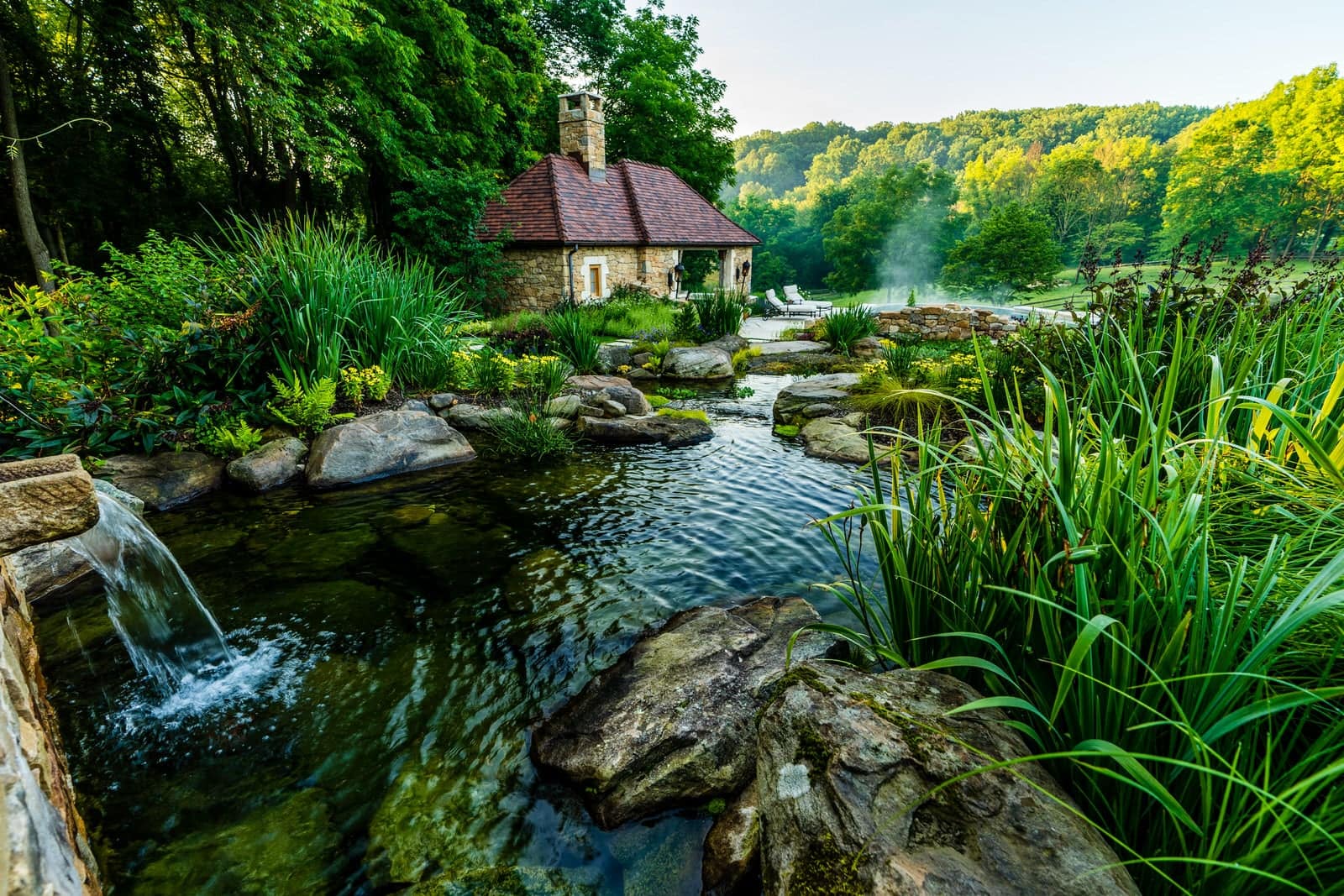 This remarkable project evolved from a simple swimming pool project into a much grander, more complicated venture. A simple oval pool was embellished with a vanishing edge detail, a separate four-season spa, a new open pool pavilion, and a collection of remnant structures suggesting a time-worn ruin or bygone farmstead, adapted for reuse. In keeping with the French Provençal vernacular, richly-textured antique limestone was used throughout the project for continuity. An outdoor kitchen space was developed closer to the main house, complete with a rustic timber pergola, antique stone sink, and striking outdoor fireplace. To connect this space with the pool, a recirculating series of ponds, rills, and waterfalls flow downgrade towards the pool, ending in a bog planting; the moving water becomes the datum around which the other site elements relate. The bog also clarifies stormwater via bioremediation. Surrounding plantings reflect the loose nature of the layout, suggesting nature is slowly overtaking the space while the built world is receding further into antiquity.