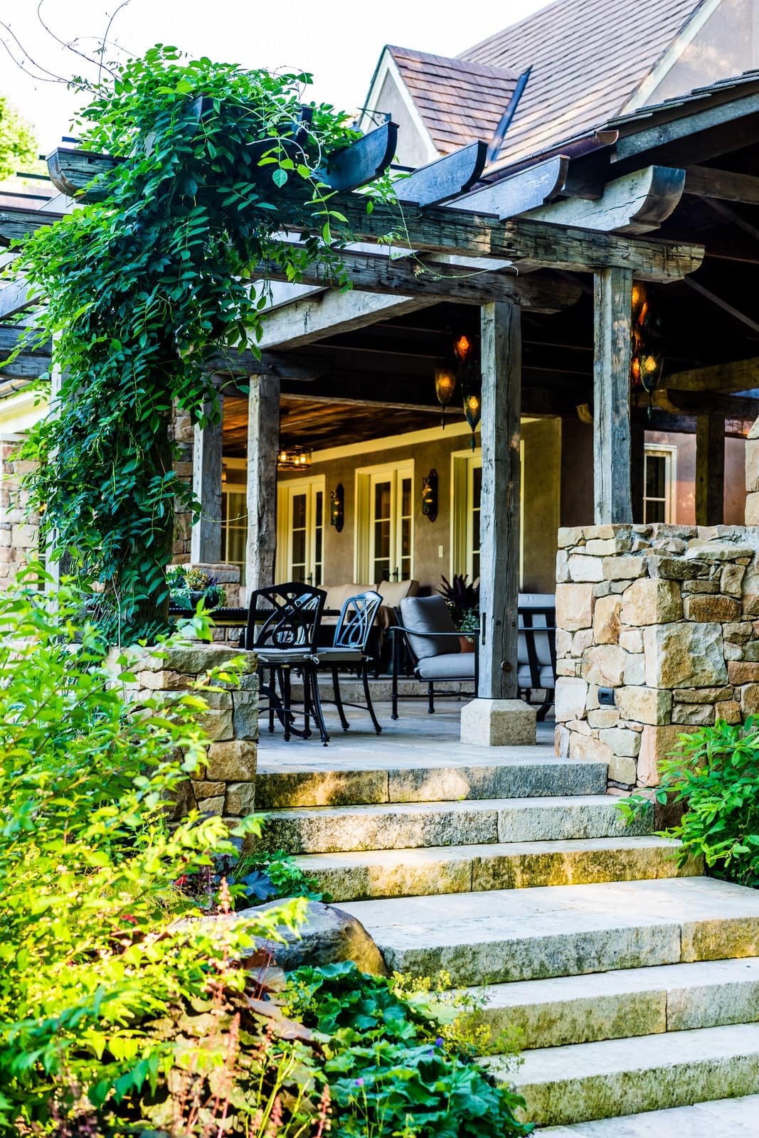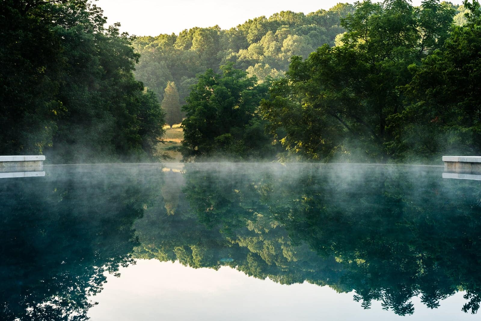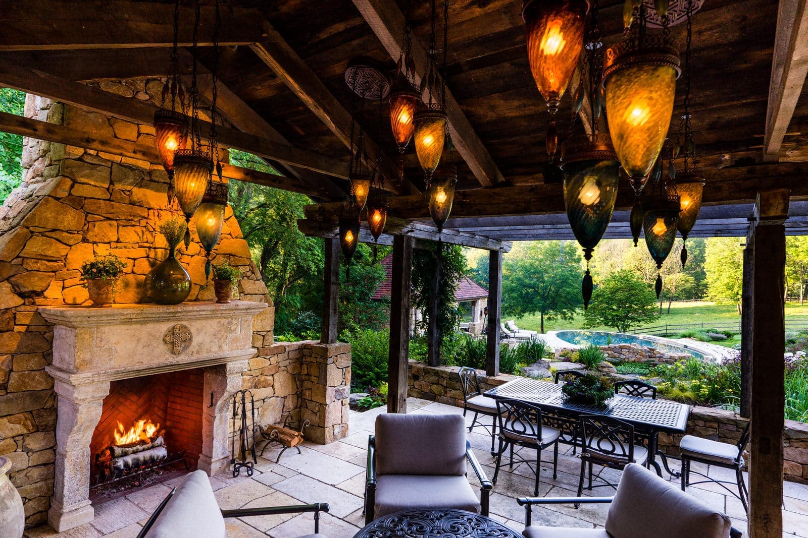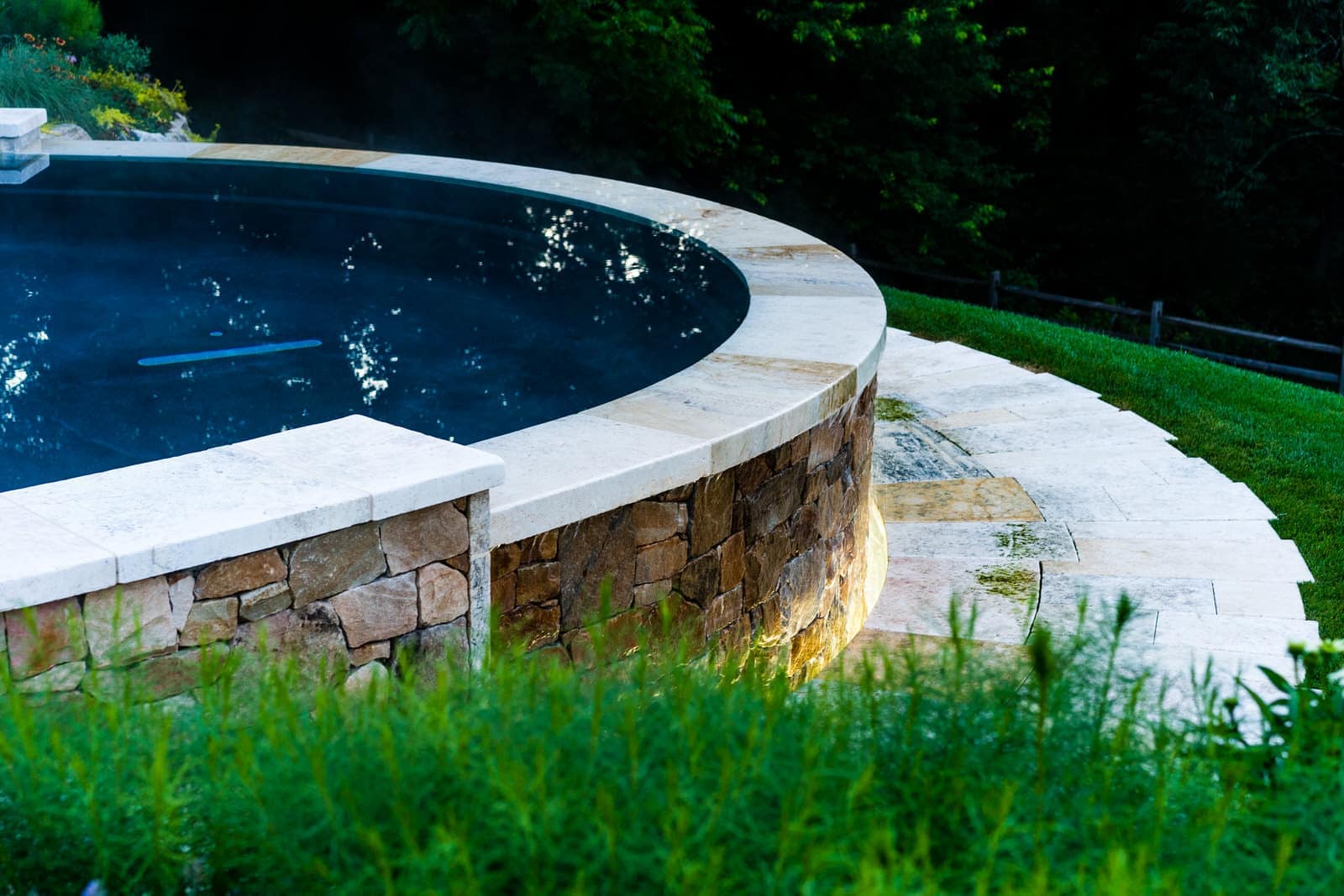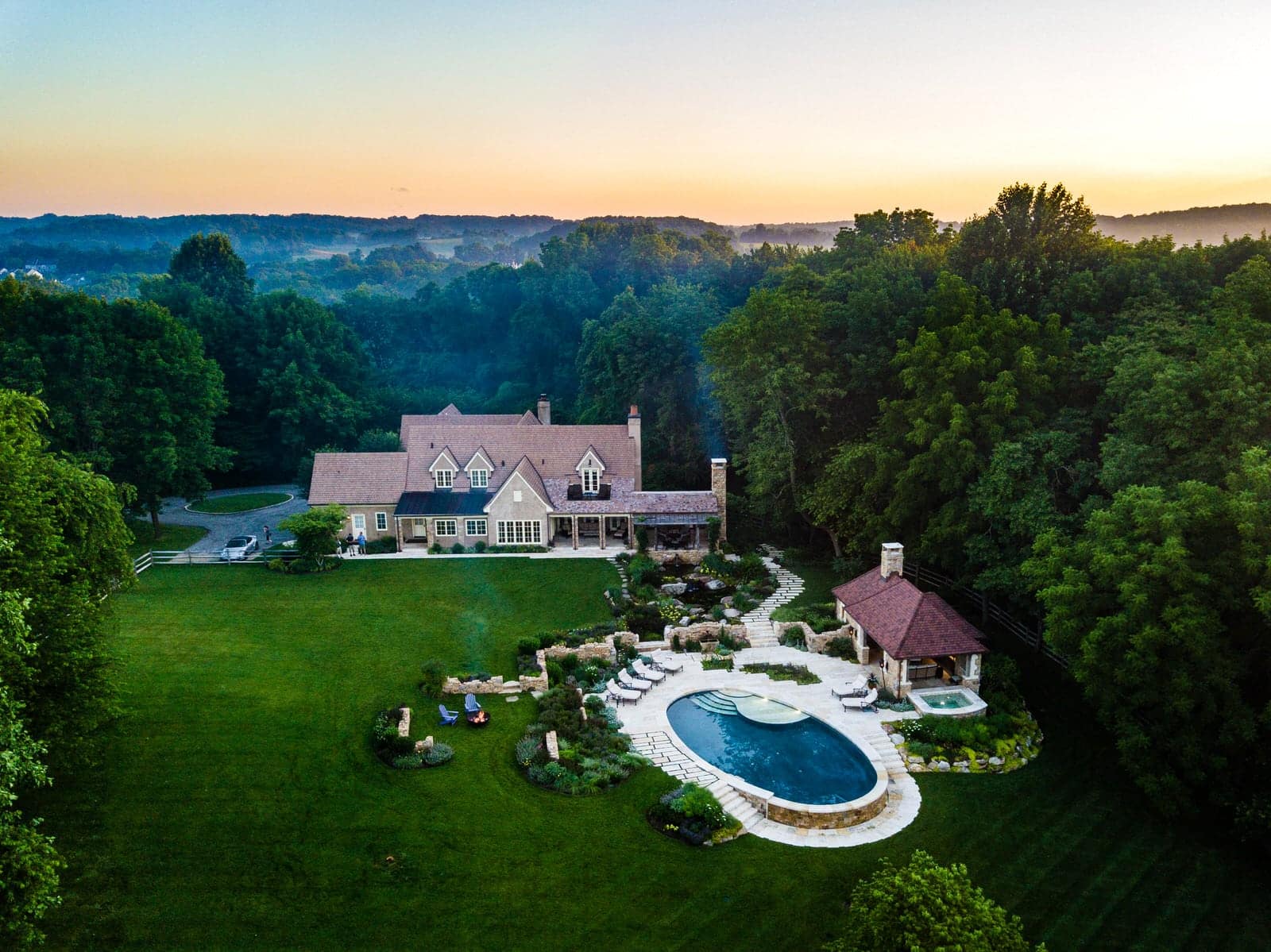 This remarkable project evolved from a simple swimming pool project into a much grander, more complicated venture. A simple oval pool was embellished with a vanishing edge detail, a separate four-season spa, a new open pool pavilion, and a collection of remnant structures suggesting a time-worn ruin or bygone farmstead, adapted for reuse. In keeping with the French Provençal vernacular, richly-textured antique limestone was used throughout the project for continuity. An outdoor kitchen space was developed closer to the main house, complete with a rustic timber pergola, antique stone sink, and striking outdoor fireplace. To connect this space with the pool, a recirculating series of ponds, rills, and waterfalls flow downgrade towards the pool, ending in a bog planting; the moving water becomes the datum around which the other site elements relate. The bog also clarifies stormwater via bioremediation. Surrounding plantings reflect the loose nature of the layout, suggesting nature is slowly overtaking the space while the built world is receding further into antiquity.
