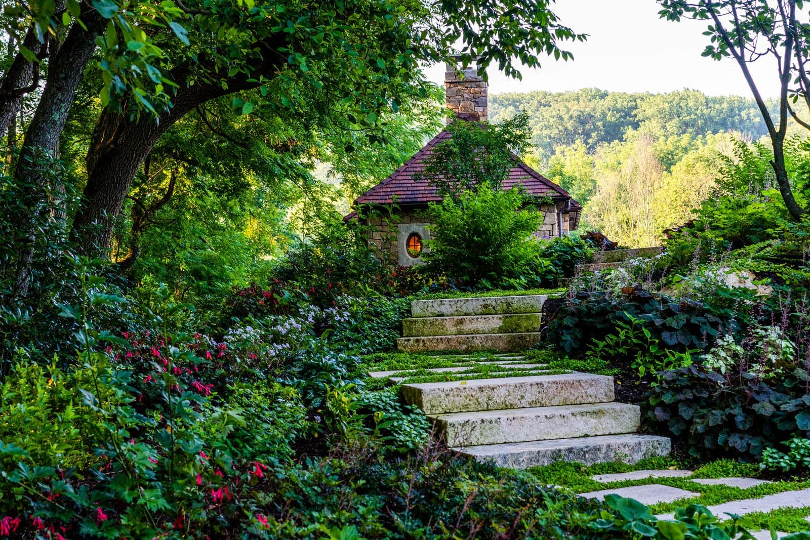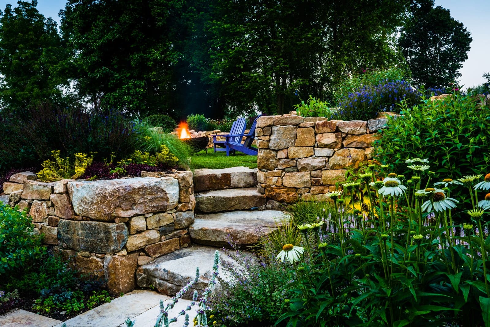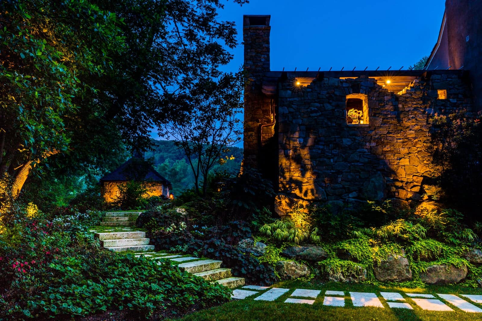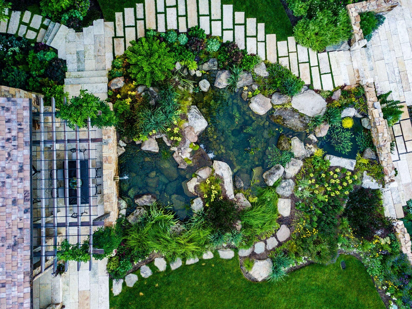 This remarkable project evolved from a simple swimming pool project into a much grander, more complicated venture. A simple oval pool was embellished with a vanishing edge detail, a separate four-season spa, a new open pool pavilion, and a collection of remnant structures suggesting a time-worn ruin or bygone farmstead, adapted for reuse. In keeping with the French Provençal vernacular, richly-textured antique limestone was used throughout the project for continuity. An outdoor kitchen space was developed closer to the main house, complete with a rustic timber pergola, antique stone sink, and striking outdoor fireplace. To connect this space with the pool, a recirculating series of ponds, rills, and waterfalls flow downgrade towards the pool, ending in a bog planting; the moving water becomes the datum around which the other site elements relate. The bog also clarifies stormwater via bioremediation. Surrounding plantings reflect the loose nature of the layout, suggesting nature is slowly overtaking the space while the built world is receding further into antiquity.