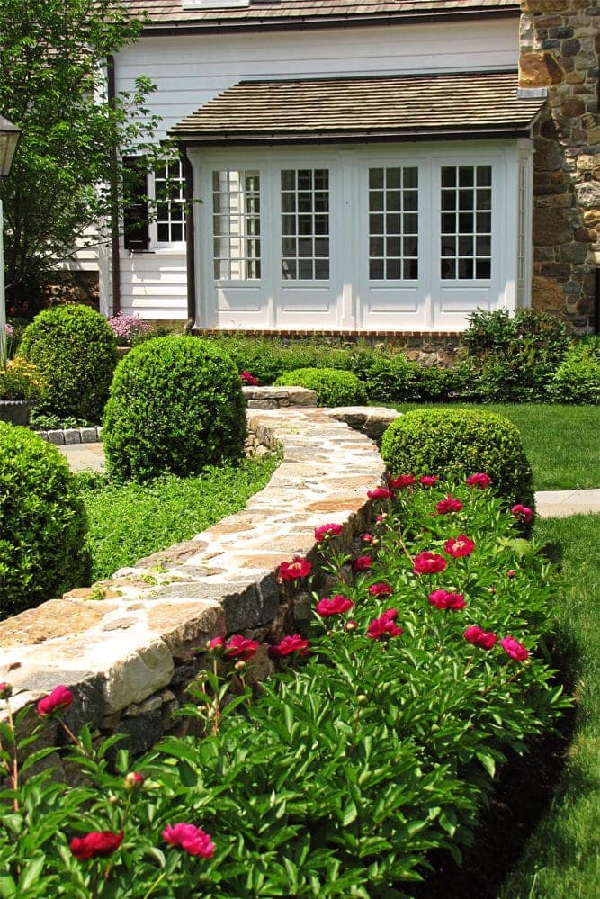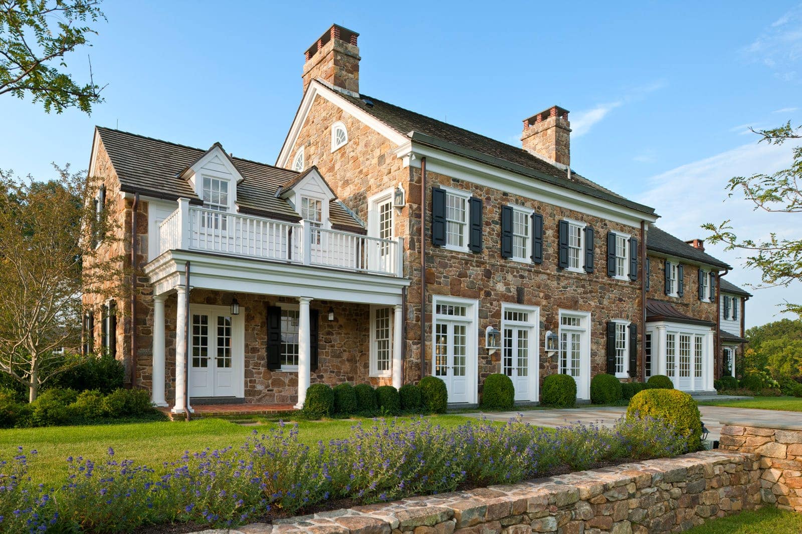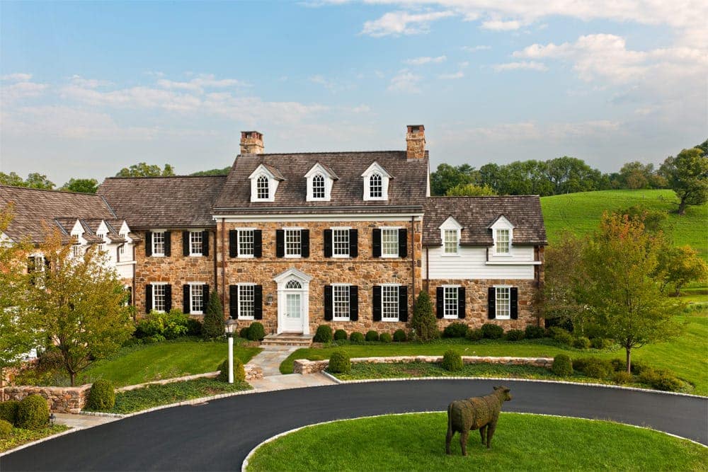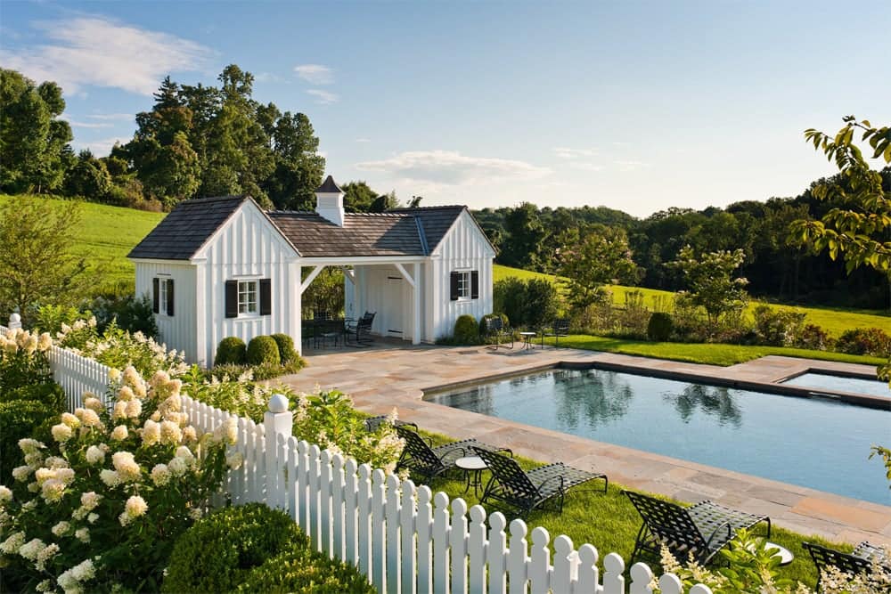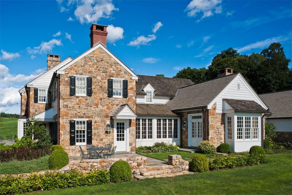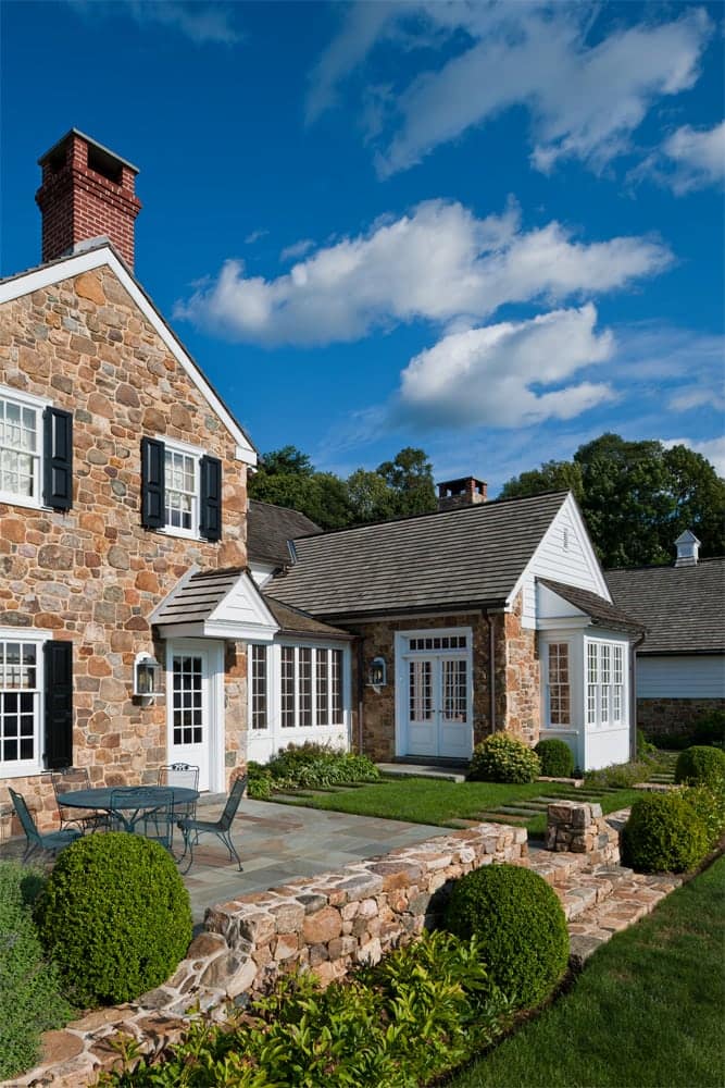 While brand new, this home’s traditionalist vernacular is uncompromising, befitting its beautiful bucolic setting. As such, the project presented an opportunity for the intermarriage of purist, Pennsylvania farmstead refinement, with prevailing modern design solutions. The pool was positioned away from the dwelling in a separate area. There was a deliberate effort made when designing the garden spaces to pull the plantings away from the foundation, so as not to obscure the authentic architectural details.