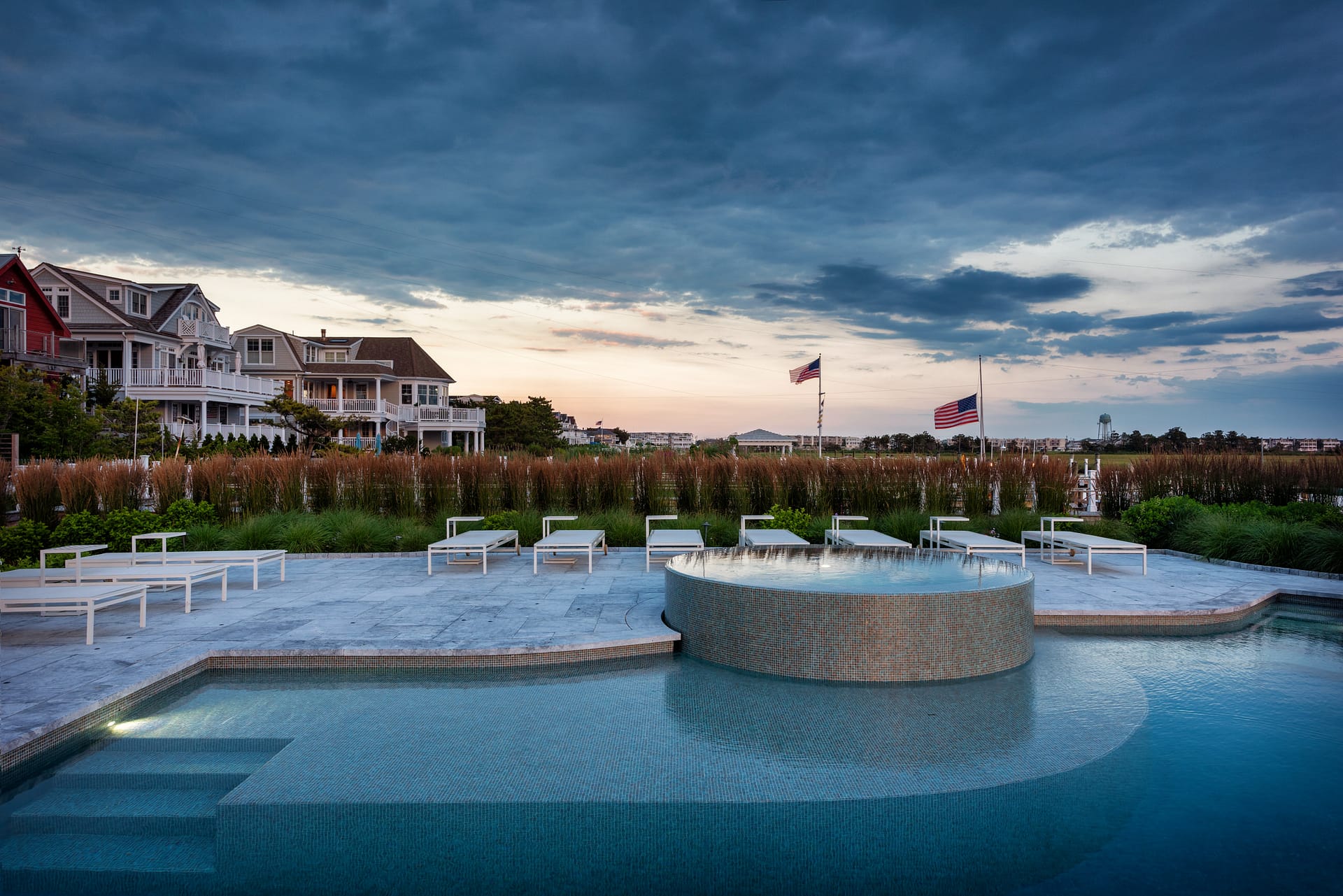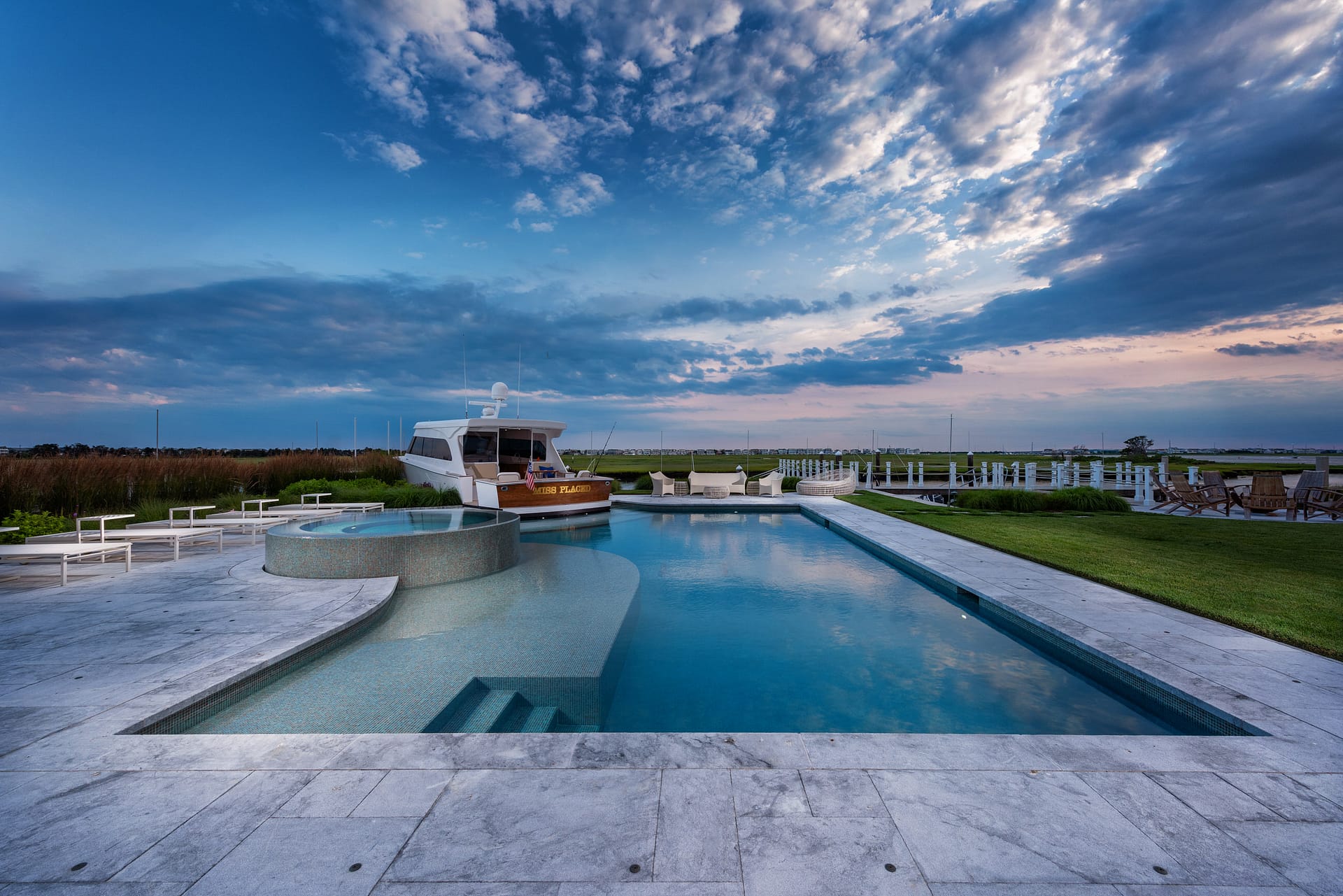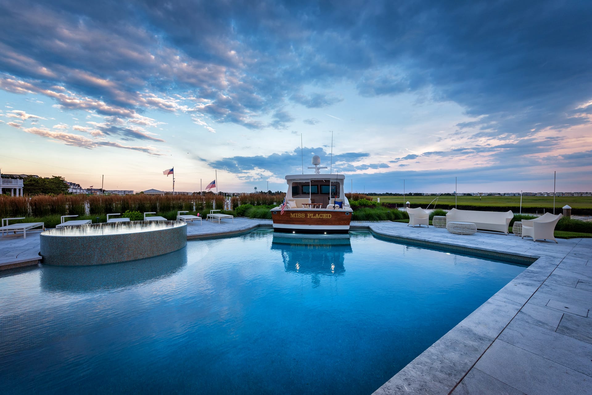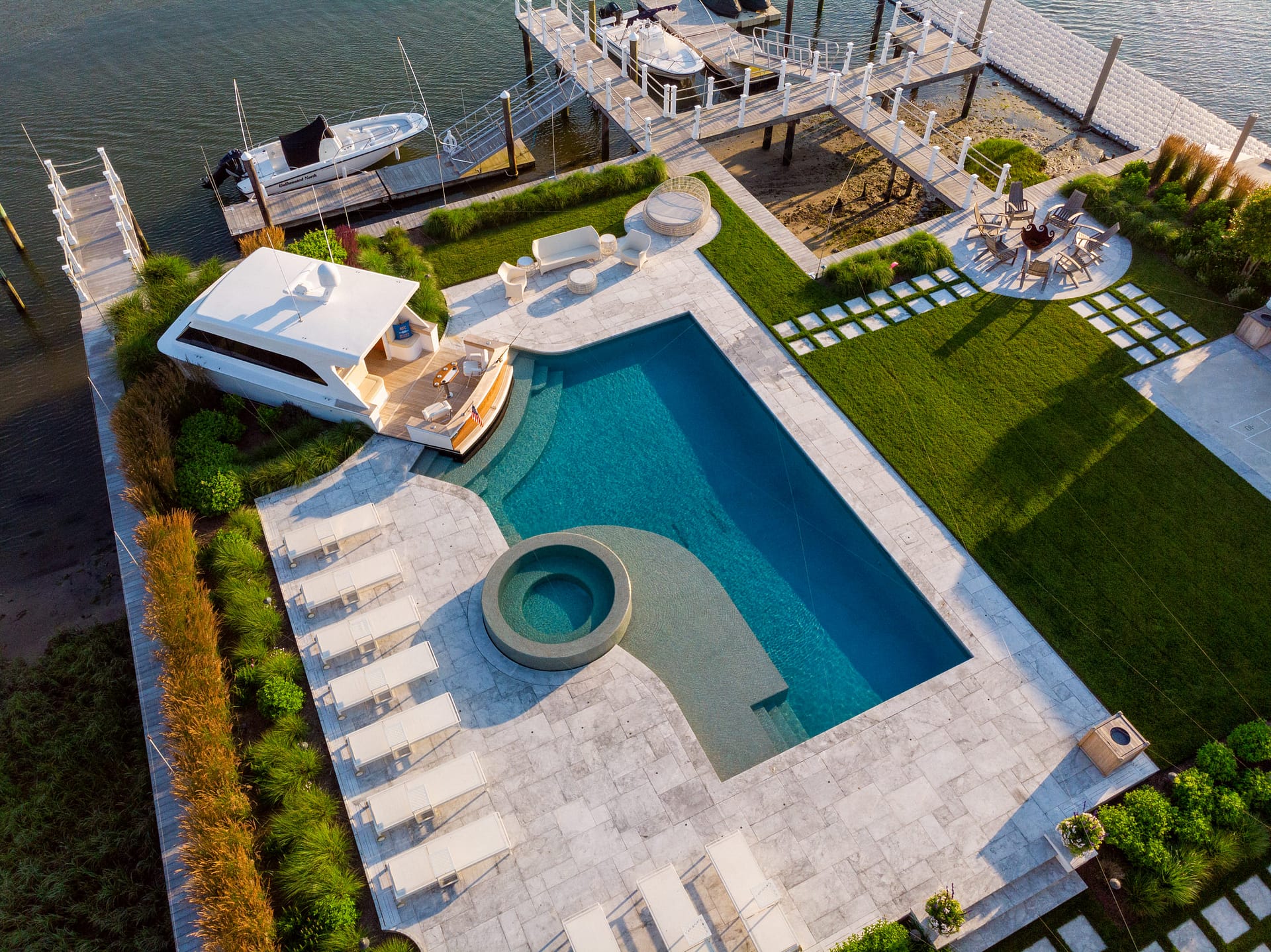 Located on the bay, this project consists of three conjoined properties all designed with one cohesive vision: creating an entertainment oasis. Nautically-inspired details are incorporated throughout the property, but none more apparent than the custom Pool Boat Cabana that is integrally designed with the swimming pool. Born out of our client’s vision for a folly-like destination at the pool area, the boat cabana – ironically named “Miss Placed” – resides as the centerpiece of the rear yard. Interior pool benches and steps are located within to enhance the experience around the boat. Additionally, the pool’s lighting and plumbing are intended to replicate a functioning vessel. A custom, round, overflowing spa, tiled sun-shelf, and expansive pool terrace completes the pool area. The remaining property features a custom firepit space, shuffleboard court, grilling area, and water wall – making this a haven for entertainment. The landscape palette is comprised of species with seasonal interest and tolerance of the harsh maritime environment.