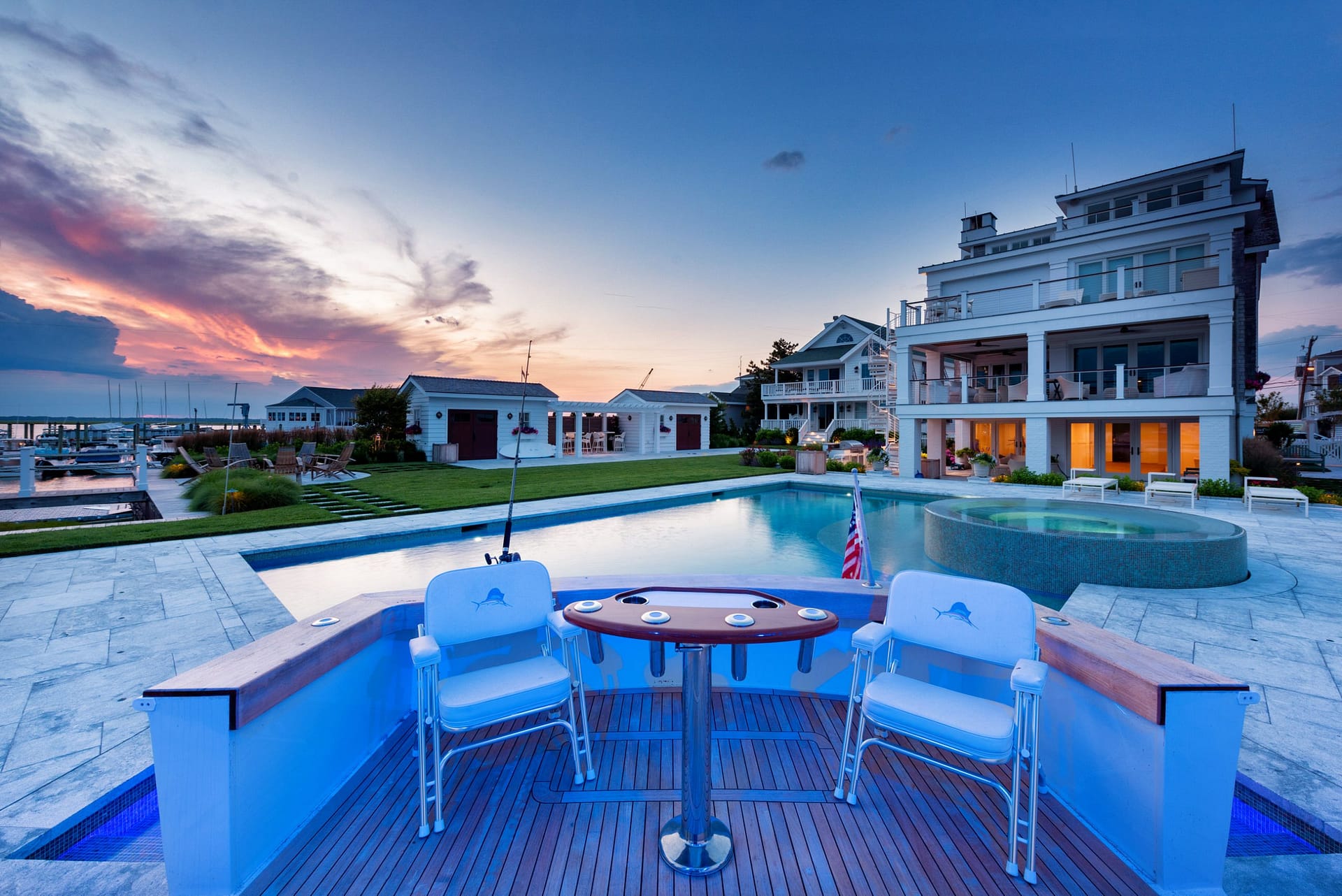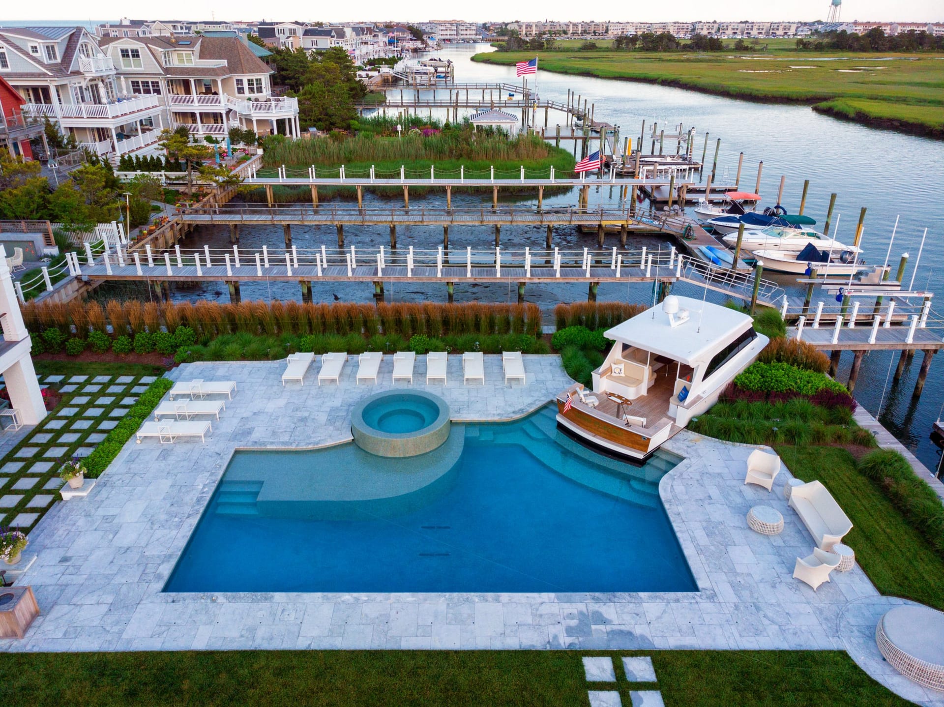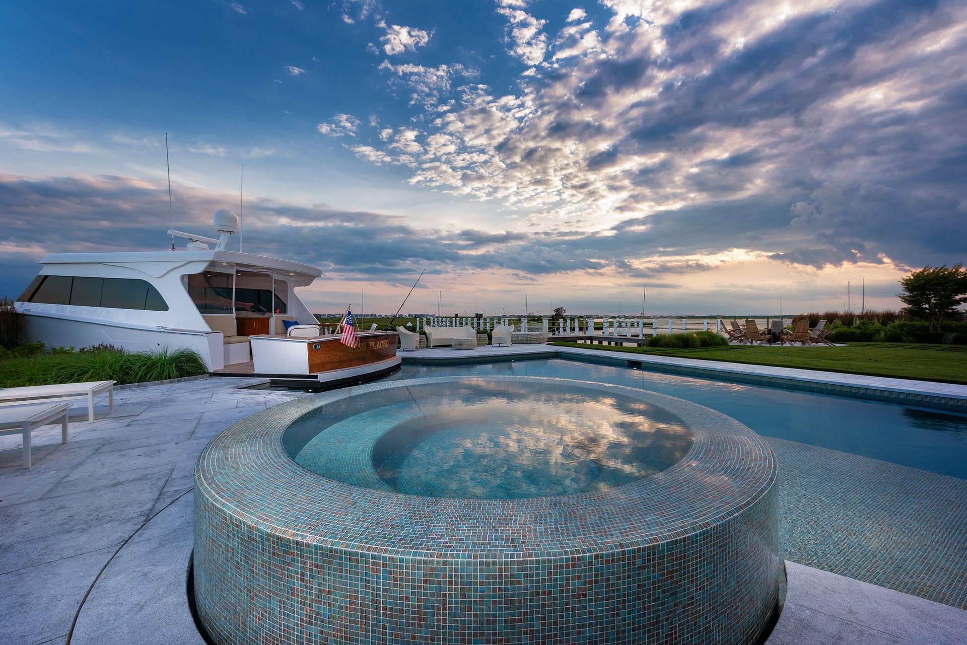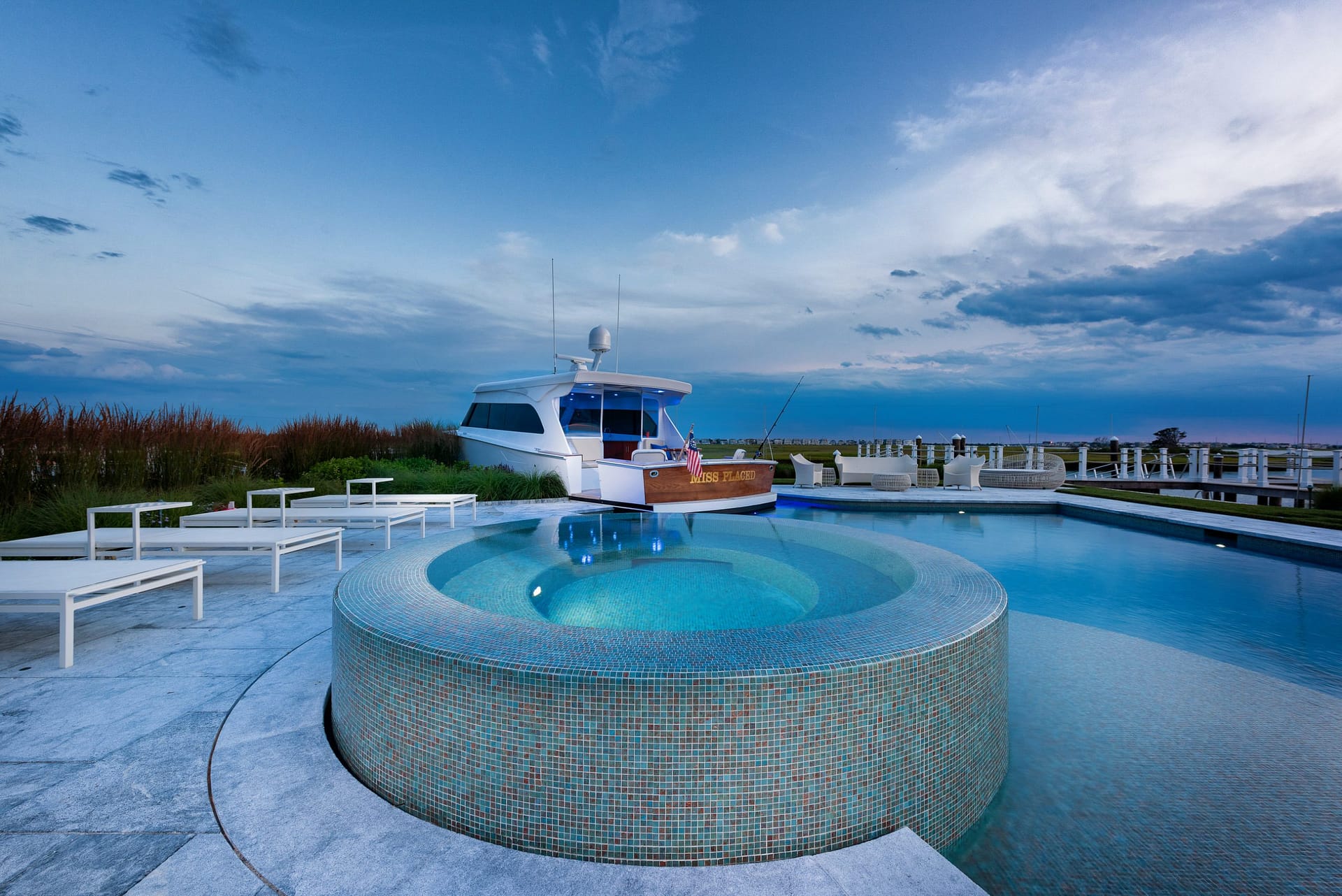 Located on the bay, this project consists of three conjoined properties all designed with one cohesive vision: creating an entertainment oasis. Nautically-inspired details are incorporated throughout the property, but none more apparent than the custom Pool Boat Cabana that is integrally designed with the swimming pool. Born out of our client’s vision for a folly-like destination at the pool area, the boat cabana – ironically named “Miss Placed” – resides as the centerpiece of the rear yard. Interior pool benches and steps are located within to enhance the experience around the boat. Additionally, the pool’s lighting and plumbing are intended to replicate a functioning vessel. A custom, round, overflowing spa, tiled sun-shelf, and expansive pool terrace completes the pool area. The remaining property features a custom firepit space, shuffleboard court, grilling area, and water wall – making this a haven for entertainment. The landscape palette is comprised of species with seasonal interest and tolerance of the harsh maritime environment.